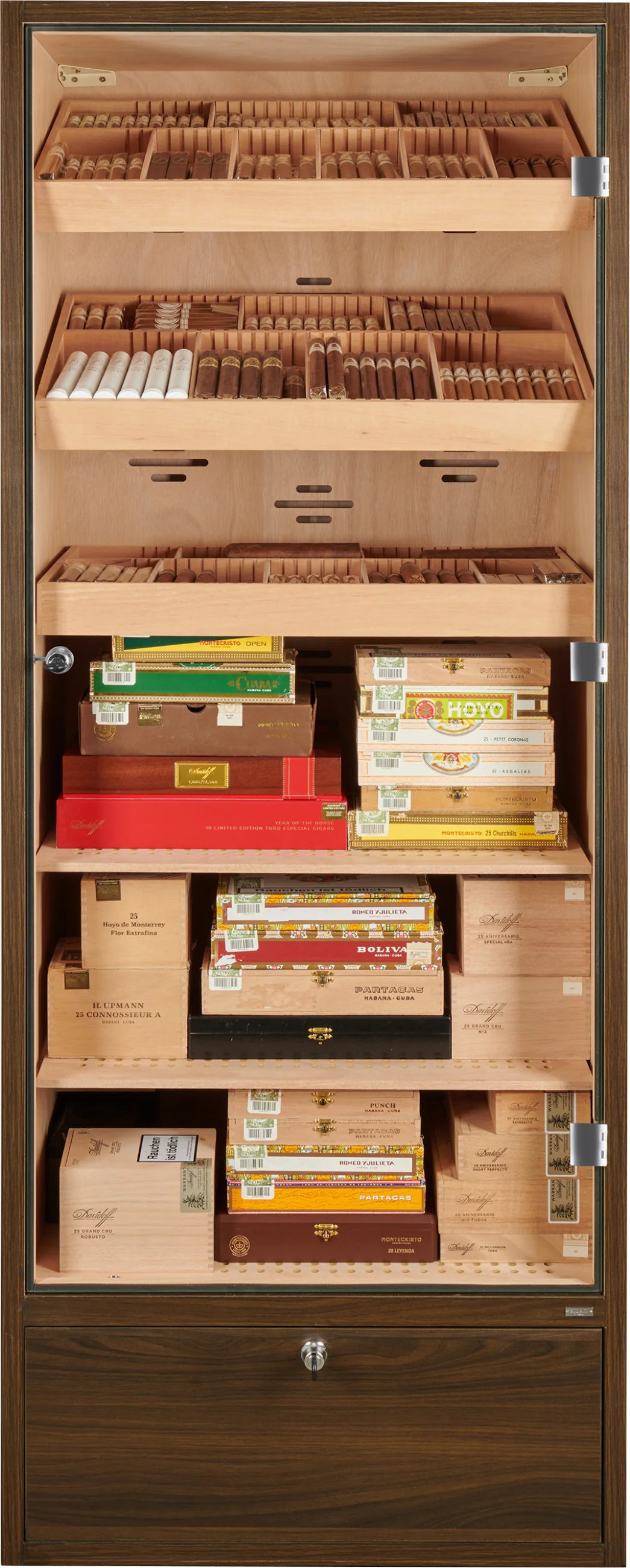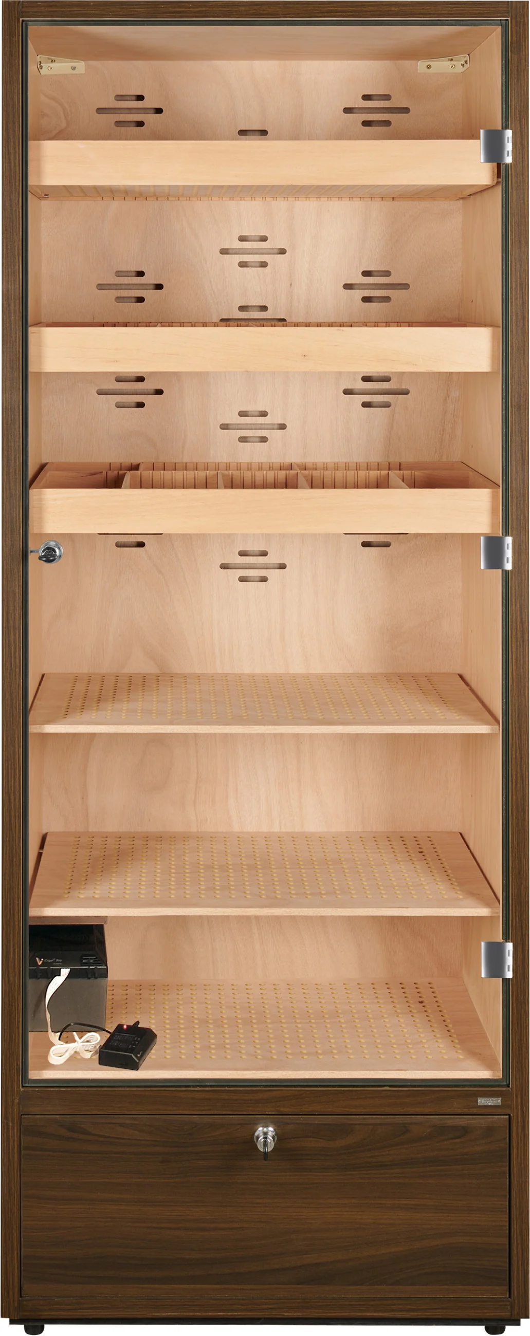 De bodem van de humidorkast bevat een afsluitbare lade die gebruikt kan worden voor het opbergen van sigaren, accessoires of verbruiksartikelen zoals gedestilleerd water. De bodem van de lade is geperforeerd en gescheiden van de binnenkant, waardoor de luchtvochtigheid kan circuleren en de sigaren veilig kunnen worden bewaard.
