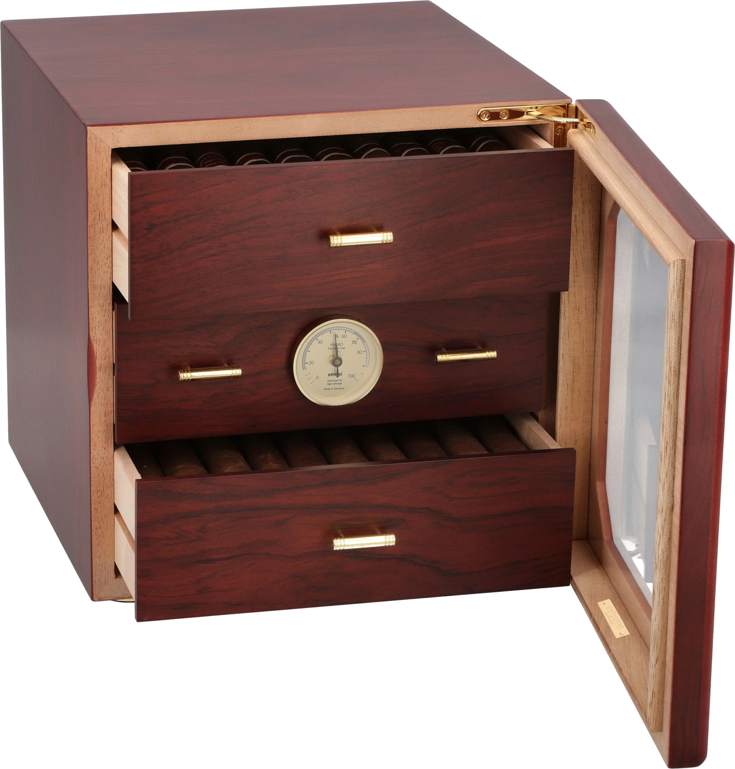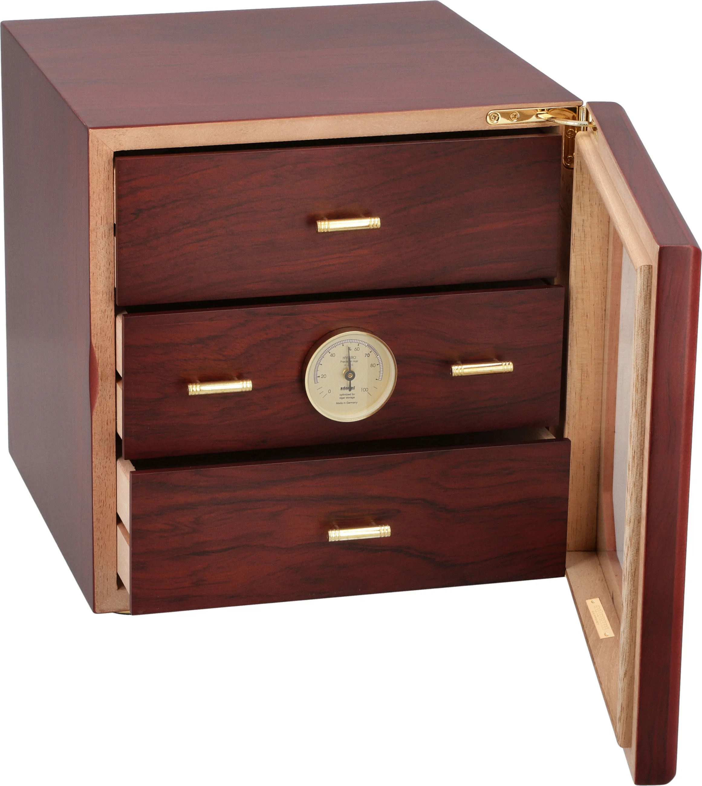 De humidor is geschikt voormeer dan 125 Corona-formaat sigaren, die in optimale staat worden gehouden door adorini's luxe vergulde luchtbevochtiger op basis van acrylpolymeer. Met verstelbare ventilatieopeningen kunt u de luchtvochtigheid verfijnen om aan uw gewenste specificaties te voldoen. Een vooraf gekalibreerde precisie-haarhygrometer is op de voorkant van de middelste bak gemonteerd, zodat u maar een korte blik hoeft te werpen om de vochtigheidsniveaus te controleren maakt niet uit of de humidor open of gesloten is.