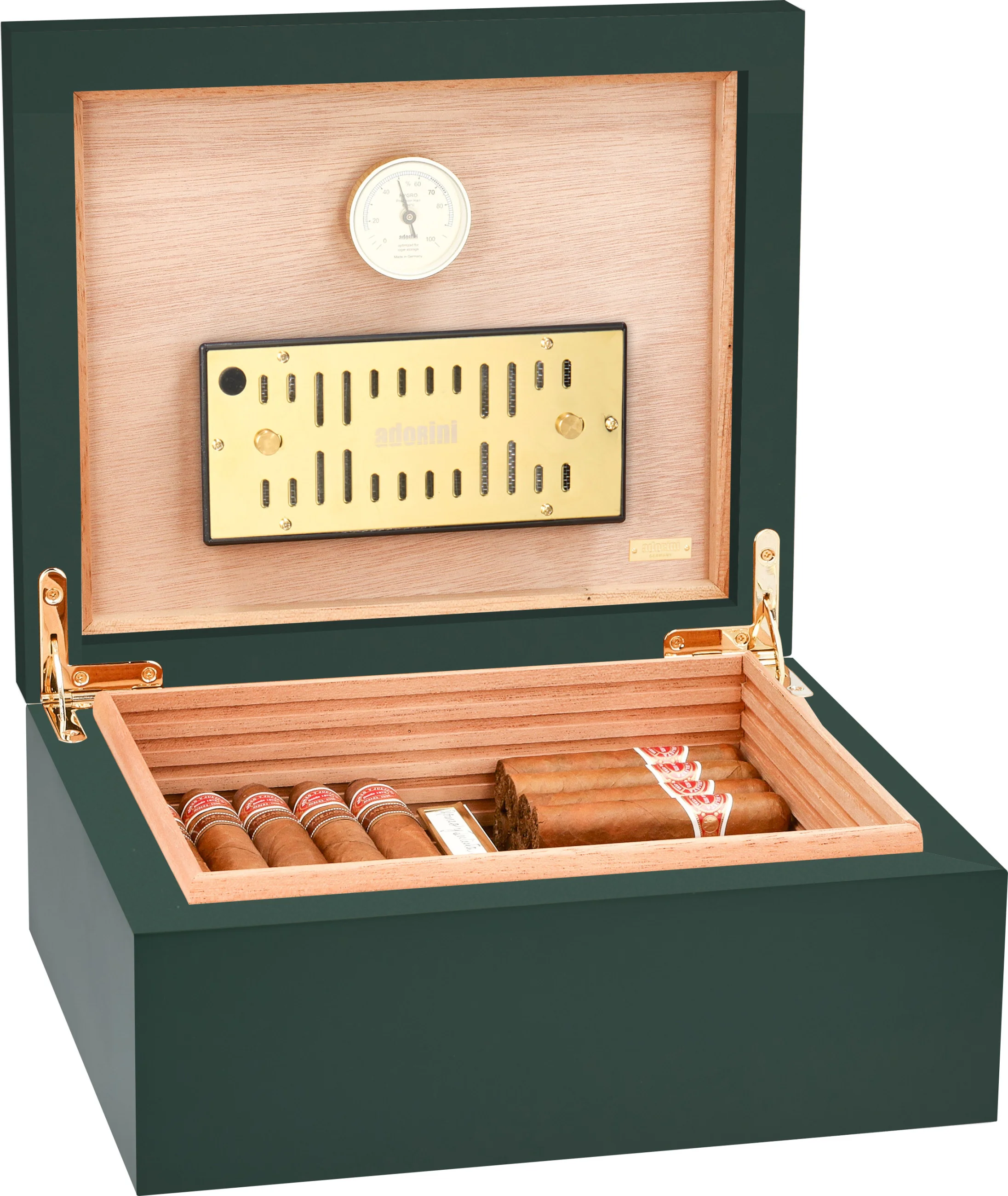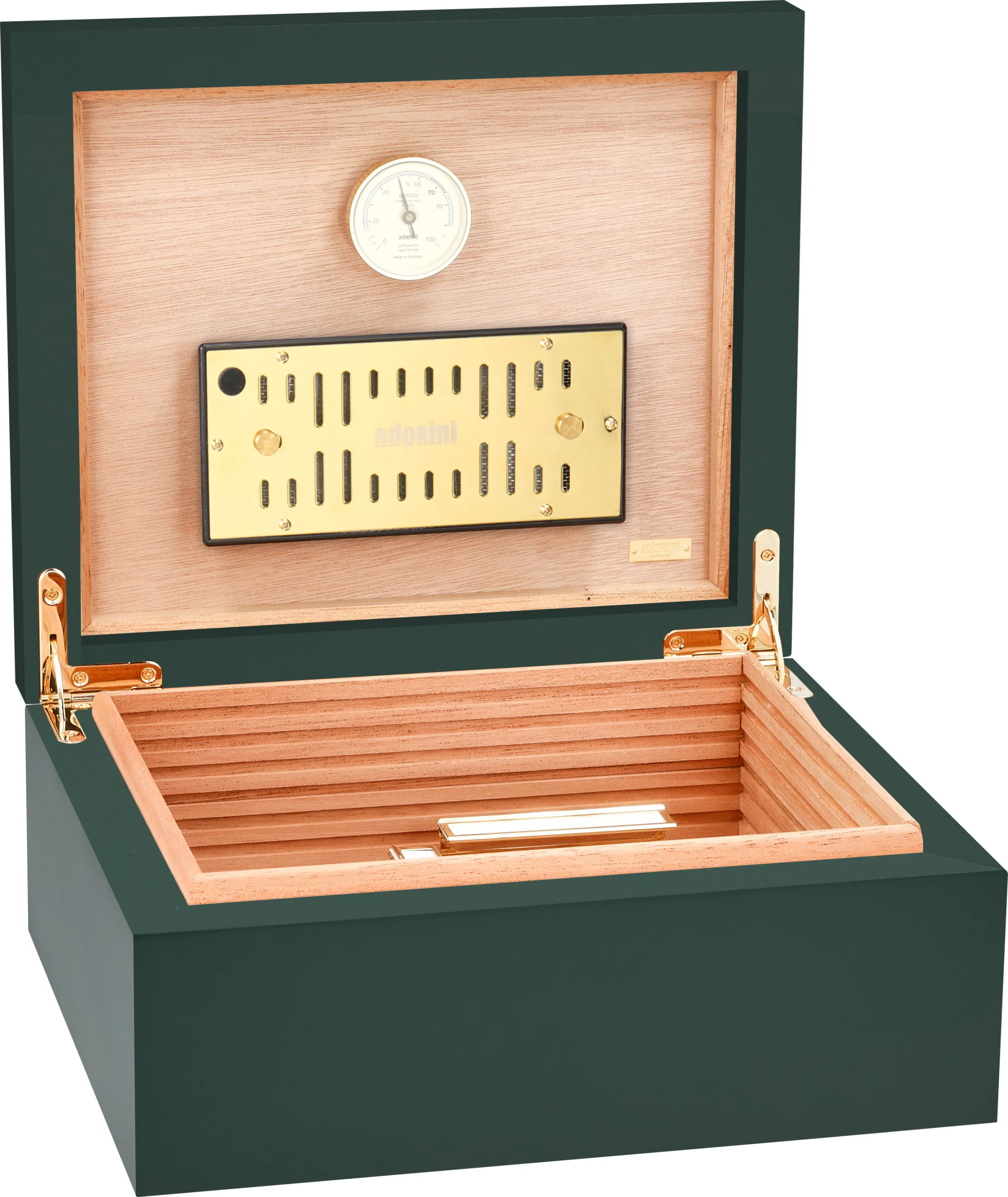 De adorini Humidor Medium Deluxe Imperial Green maakt deel uit van de nieuwe adorini collectie in vier spannende kleurvariaties. Dit model maakt indruk met een geraffineerde, tijdloze donkergroene kleur, versterkt door gouden elementen aan de binnenkant. Bijzonder opmerkelijk is de matgroene soft-touch afwerking, die verder reikt dan de buitenste rand en dus ook zichtbaar is aan de binnenkant. Dit geeft de humidor een harmonieus en elegant totaaleffect.
