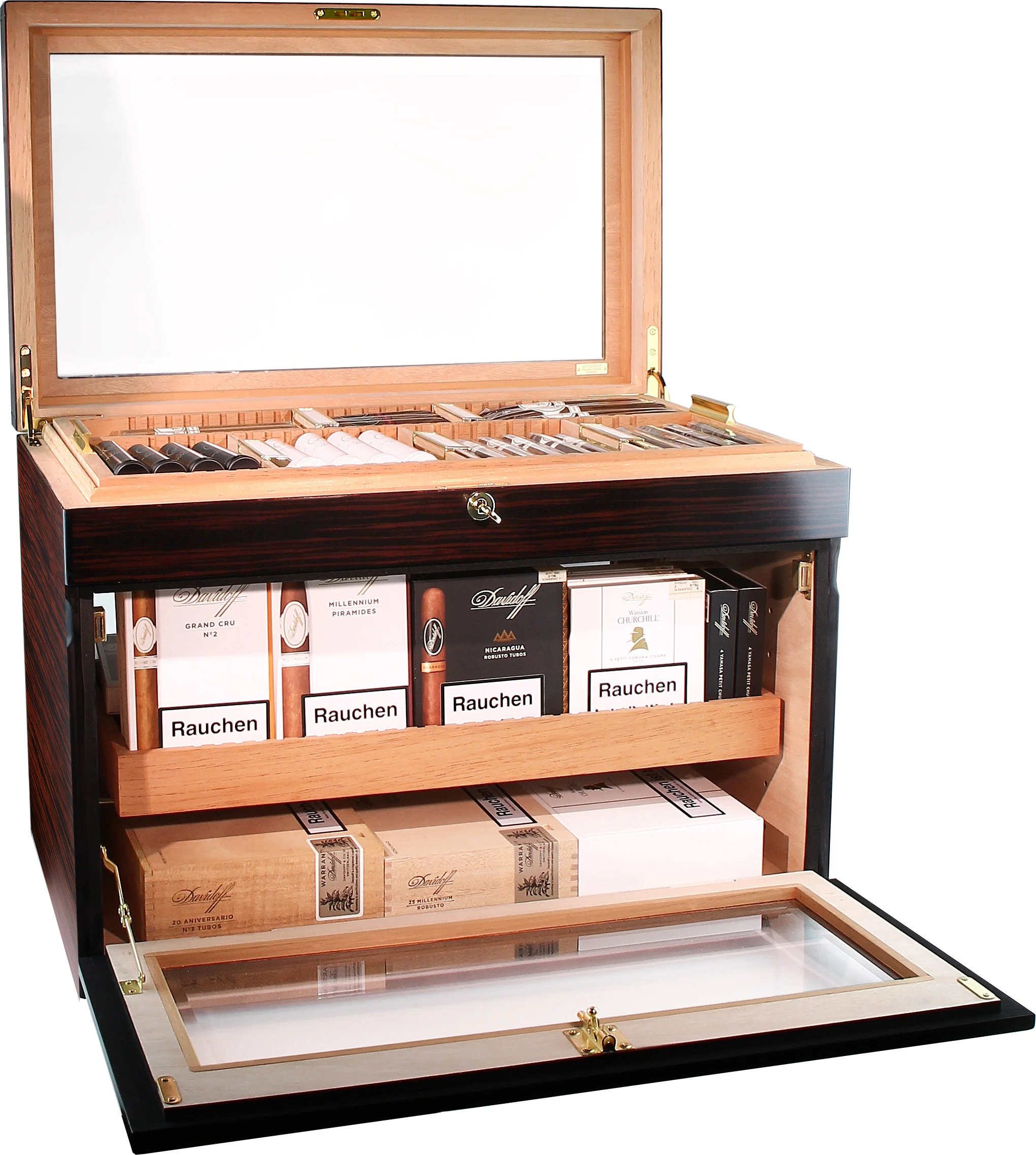 Individuele sigaren, dozen of zelfs hele sigarenkratten kunnen op meerdere niveaus worden opgeslagen. Het interieur kan worden verdeeld in verschillende compartimenten: