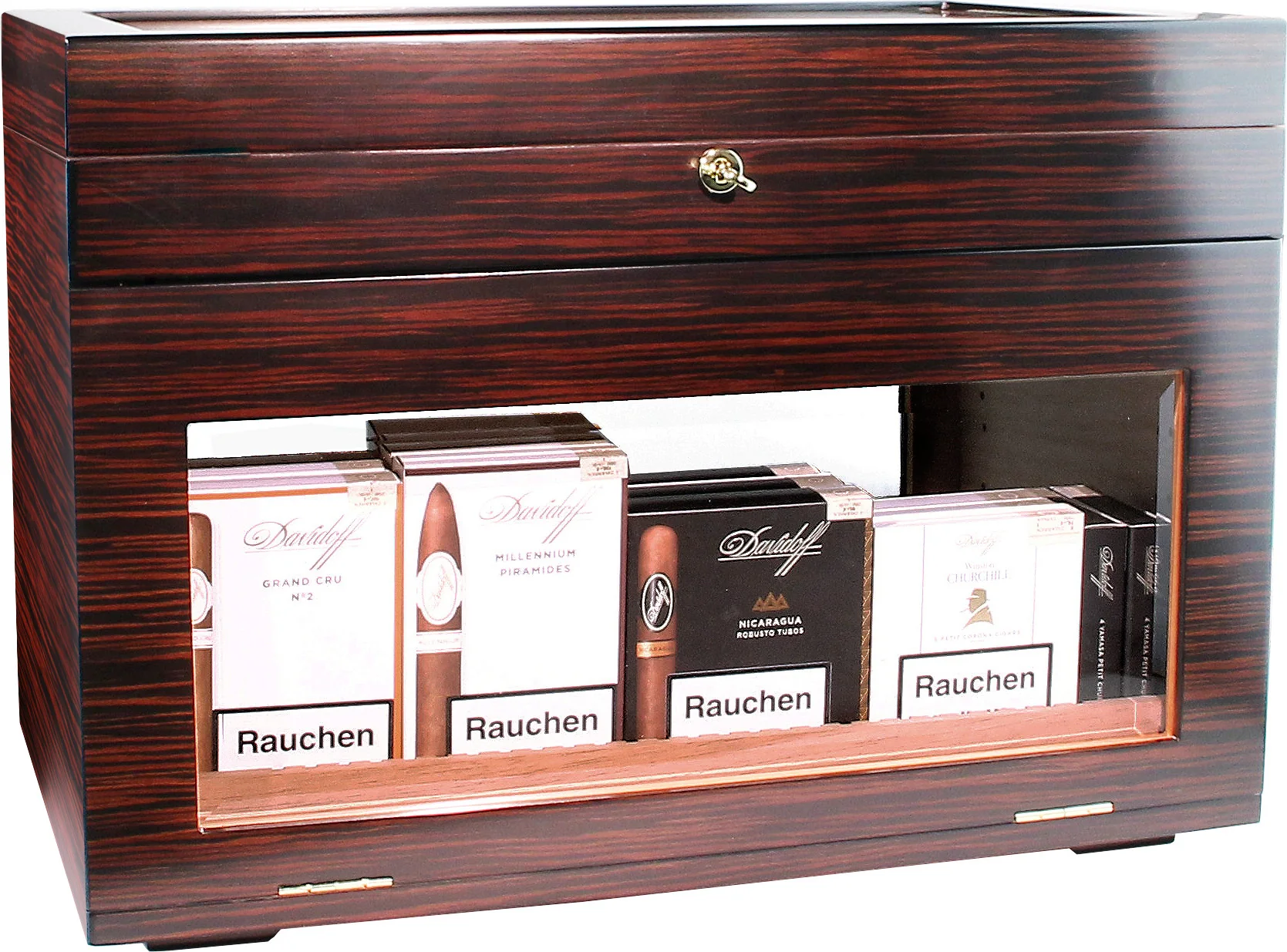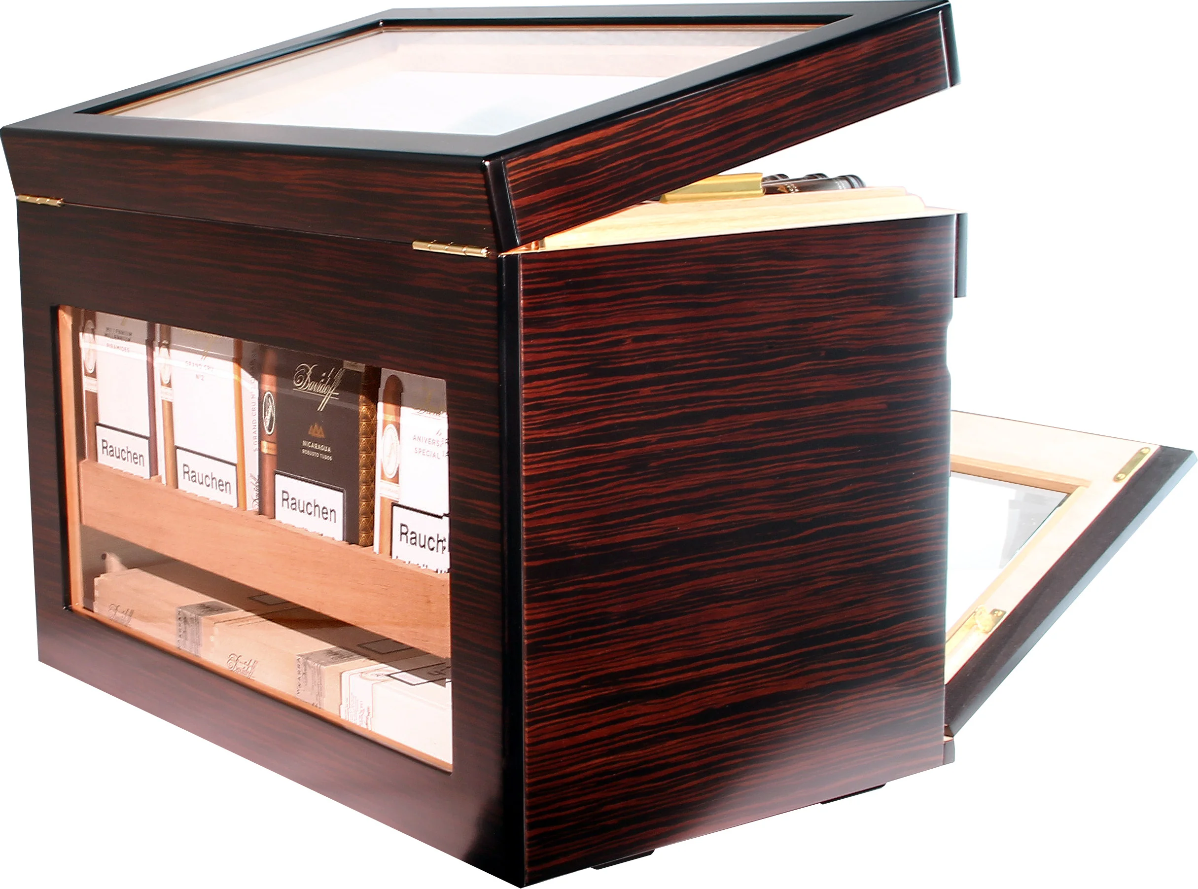- Trays voor afzonderlijke sigaren en dozen kunnen worden geplaatst en onder een hoek worden geplaatst voor een optimale presentatie.