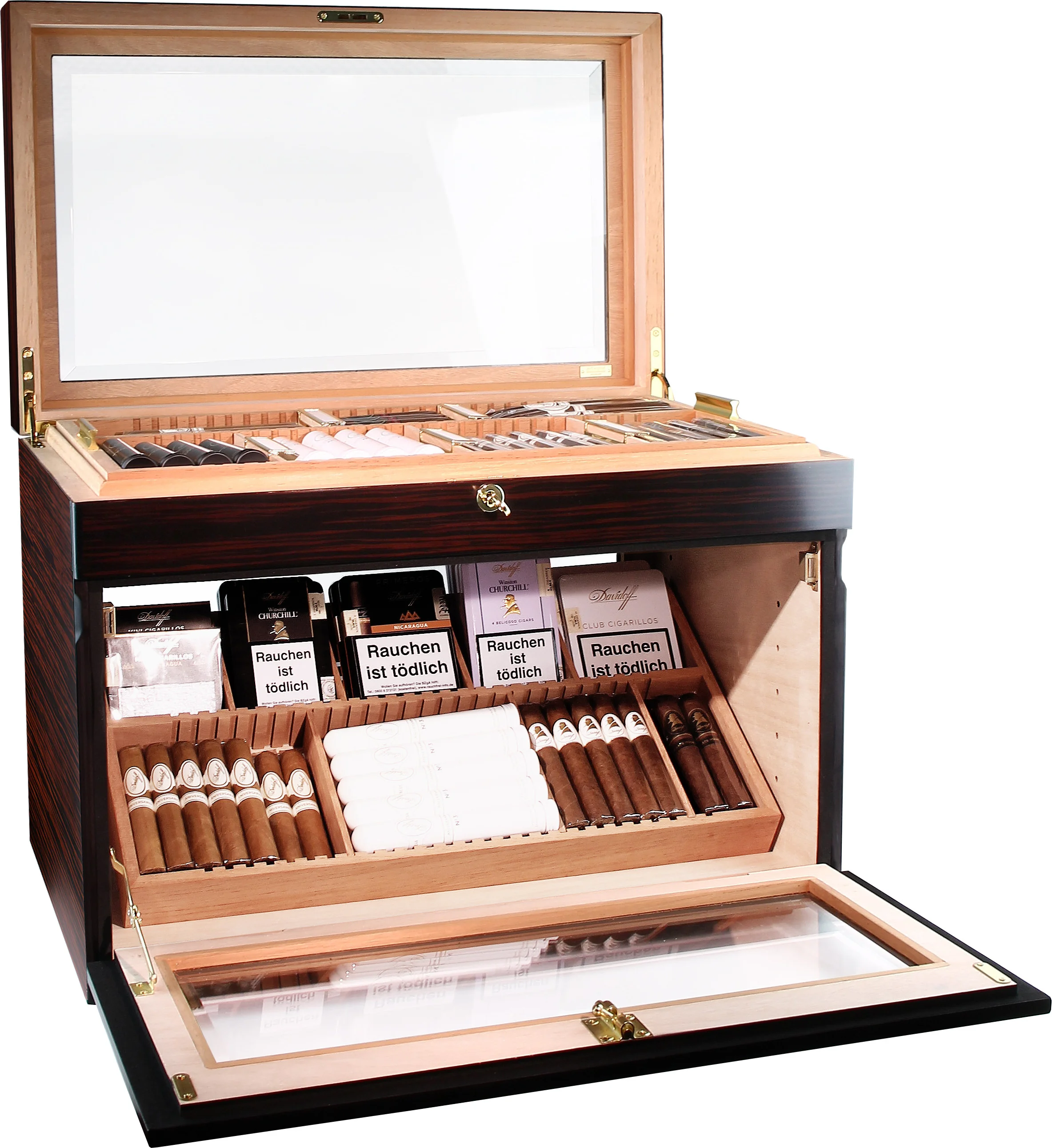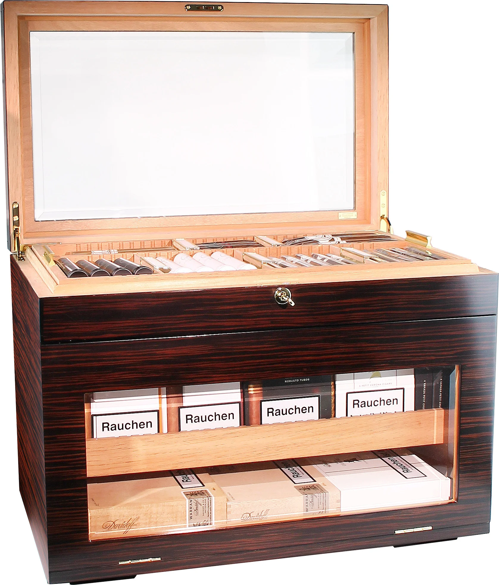 De bovenste lade, direct onder het glazen deksel, is vast. Het wordt gebruikt om losse sigaren in te bewaren, is van bovenaf verwijderbaar en is ideaal voor het serveren van gasten of op evenementen. Versierd met elegante gouden handgrepen maakt dit dienblad een bijzondere indruk. Zowel dit dienblad als de bladen eronder kunnen flexibel worden ingedeeld en georganiseerd met de bijgeleverde verdelers.