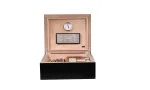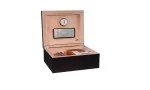 De moderne en functionele humidor van het merk adorini uit de Basic serie in maat M maakt indruk met zijn matzwarte uiterlijk en veelzijdigheid. Met ruimte voor ca. 75 sigaren of kleinere sigarenkistjes biedt hij een ideale oplossing voor het veilig bewaren van uw sigaren. De levering bevat een analoge hygrometer en een passieve sponsbevochtiger. De hygrometer meet de luchtvochtigheid op basis van een metalen spiraal en wordt samen met de luchtbevochtiger magnetisch en flexibel bevestigd aan het deksel van de humidor. De humidor heeft matzilveren scharnieren aan de binnenkant en een bijzonder sterke afdichtingslip, die zorgt voor een optimaal behoud van de luchtvochtigheid. Een verticale verdeler zorgt voor extra indeling van het interieur.