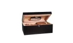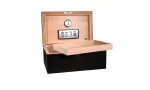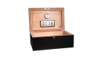 Deze moderne en functionele humidor uit de adorini basis serie in maat L maakt indruk met zijn matzwarte afwerking en veelzijdigheid. Met ruimte voor ongeveer 150 sigaren of zelfs kleinere sigarenkistjes biedt hij een ideale oplossing voor het veilig bewaren van uw sigaren. Hij wordt geleverd met een analoge hygrometer en een passieve sponsbevochtiger. De hygrometer meet de luchtvochtigheid met behulp van een metalen spoel en is samen met de luchtbevochtiger magnetisch en flexibel bevestigd aan het deksel van de humidor. De humidor is ook uitgerust met een slot ter bescherming tegen ongeautoriseerde toegang. Een dubbele set sleutels wordt meegeleverd zodat u een reservesleutel heeft. De humidor heeft matzilveren scharnieren aan de binnenkant en een bijzonder sterke afdichtingslip, die zorgt voor een optimale vochtretentie. Een verticale verdeler zorgt voor extra compartimentering van het interieur. Een extra, verwijderbare standaard organiseert de humidor op een esthetische en functionele manier. Hij is afneembaar en voorzien van ventilatiegroeven voor een optimale vochtcirculatie.