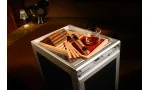 Het interieur van de trolley is bekleed met hoogwaardig okume hout, dat wordt gekenmerkt door zijn vochtbestendige eigenschappen - ideaal voor het opbergen van sigaren. Twee niveaus bieden flexibele opbergruimte voor dozen of losse sigaren, terwijl een aparte aluminium lade in het onderste gedeelte ruimte biedt voor accessoires of flessen.