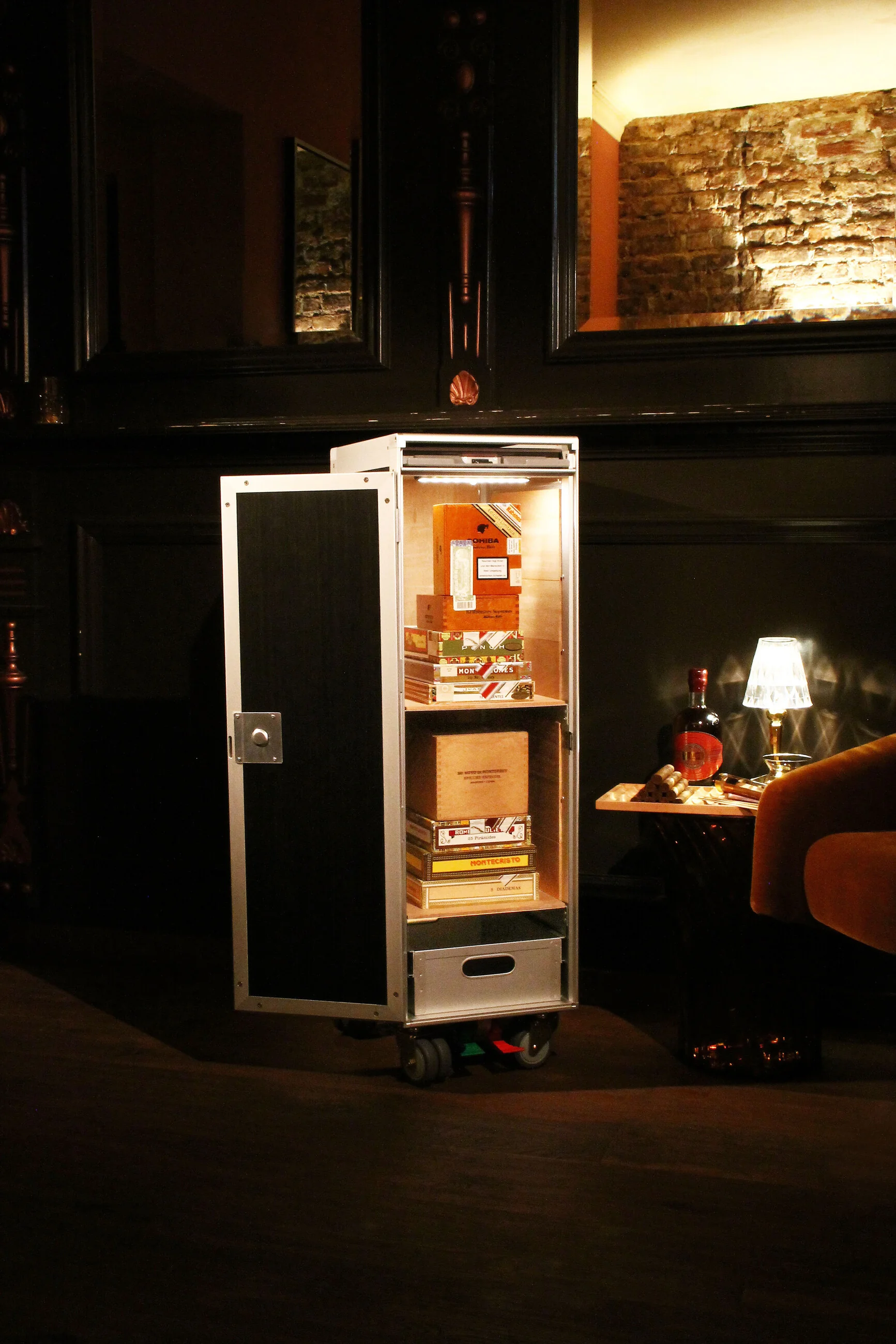 De buitenkant van de trolley is versierd met elegant zwart houtfineer, wat een mooi contrast vormt met de zilverkleurige aluminium behuizing. Met een simpele hendelbeweging opent u de veiligheidsgrendel die de trolley veilig vergrendelt en verder kan worden beveiligd met een optioneel hangslot. De trolley staat op 8 wielen die 360 graden kunnen draaien, waardoor hij moeiteloos mobiel is, terwijl een rem met voetpedaal zorgt voor stabiliteit in elke positie. Bovenop zit een ultraplatte lade, die gemakkelijk toegang biedt tot uw sigarenknipper, pons, cederhouten vullingen of andere accessoires.