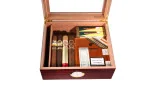 De elegante humidor van BigSmoke biedt genoeg ruimte voor uw waardevolle schatten met een geschatte capaciteit van ongeveer 50 sigaren. Zelfs kleinere sigarenkistjes kunnen gemakkelijk hun plek vinden. De elegante nerf van de humidor wordt aangevuld door een glazen deksel dat een blik op het interieur geeft zonder dat u de humidor hoeft te openen. Een analoge hygrometer op basis van een metalen spiraal is in de voorkant verwerkt en is altijd gemakkelijk af te lezen. De meegeleverde staafbevochtiger werkt op basis van acryl polymeerkristallen en zorgt voor een constant vochtigheidsniveau. Een verticale verdeler maakt een flexibele indeling en organisatie van het interieur mogelijk. Om de meubels waarop de humidor staat te beschermen, is de basis bekleed met vilt.