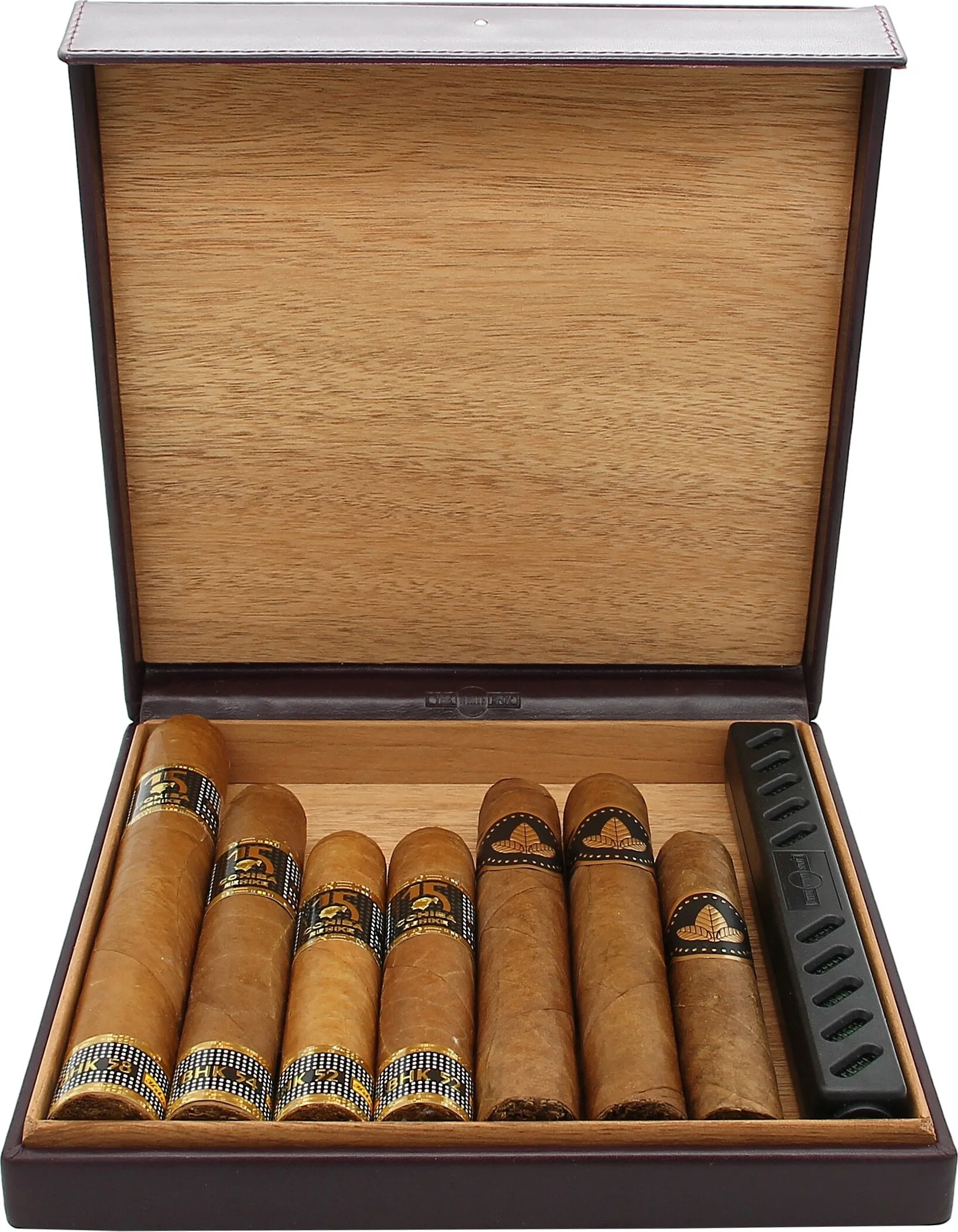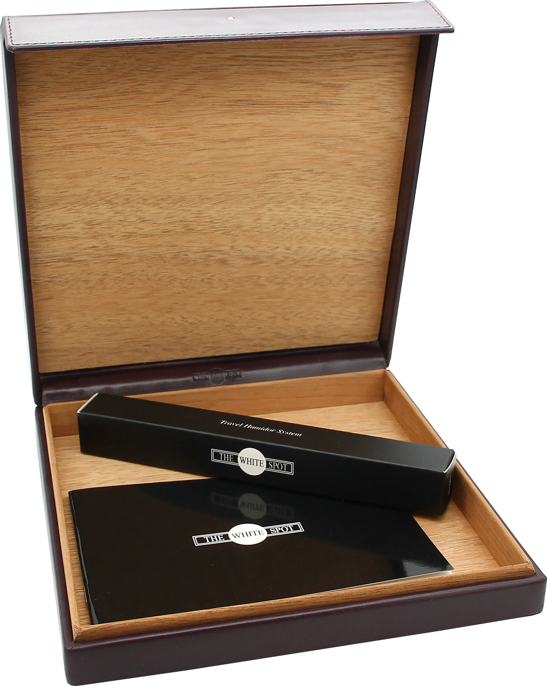 Deze elegante reishumidor in donkerpaars van het gerenommeerde Engelse erfgoedmerk Dunhill is de perfecte metgezel voor onderweg. Bekleed met het beste leer uit Spanje en gevoerd met hoogwaardig hout, biedt hij ruimte en bescherming voor ongeveer 10 sigaren. De sluiting is een magneetsluiting verborgen onder het leer. Het bulldoglogo in reliëf op het leer is een onmiskenbaar Dunhill handelsmerk, net als de beroemde White Spot op de voorkant van de humidor. Een verfijnde reishumidor die uw sigaren stijlvol beschermt en een betrouwbare metgezel blijkt te zijn op al uw reizen en uitstapjes.