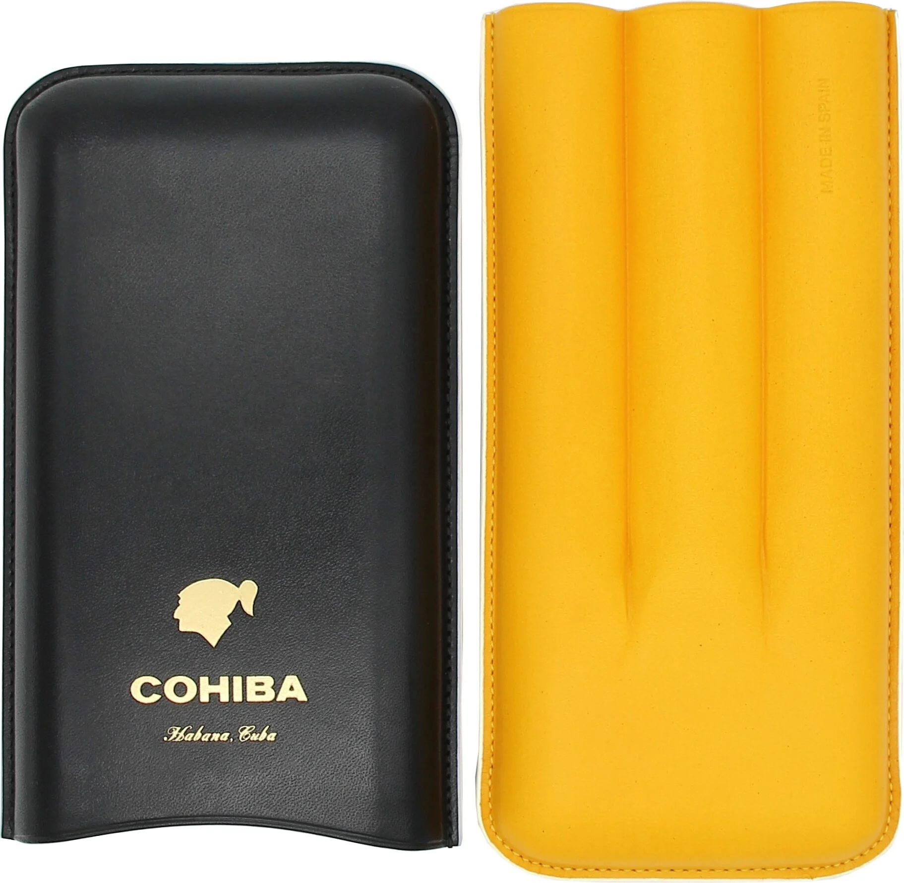 De Cohiba sigarenkoker in zwart, geel en wit is een verfijnd accessoire van Cuba's beroemdste sigarenmerk. De iconische combinatie van zwart en geel leer met een witte bies roept de typische Cohiba-look op en creëert een harmonieus contrast. Het gedrukte Cohiba logo in goud op de voorkant geeft de etui een hoogwaardige uitstraling en identificeert het duidelijk als een exclusief merkproduct.