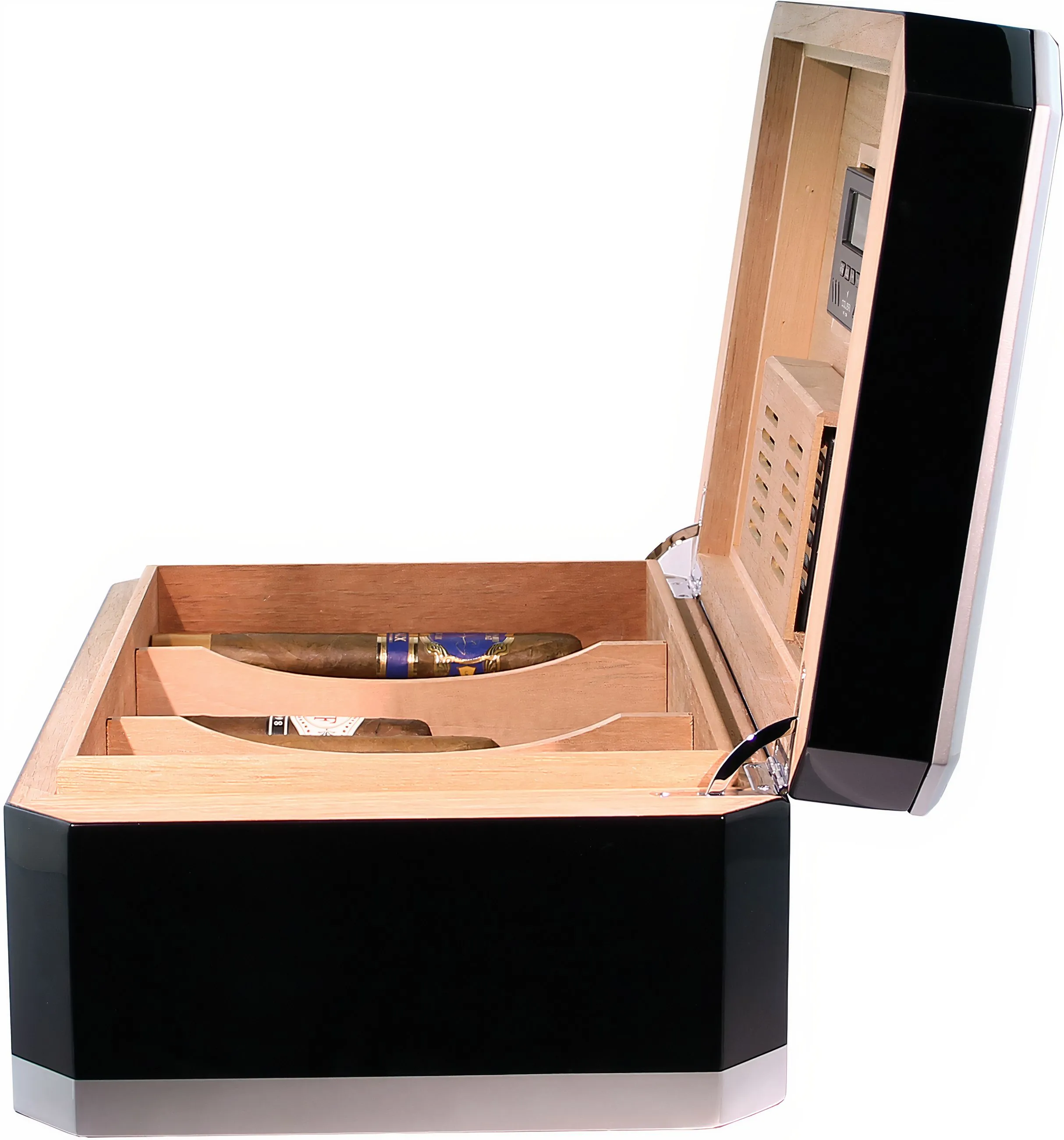 Met een capaciteit van ongeveer 100-125 sigaren biedt de humidor genoeg ruimte voor uw verzameling. Binnenin zorgen twee flexibel in te voegen of uitneembare verticale verdelers voor optimale organisatie. De meegeleverde digitale hygrometer maakt een nauwkeurige meting van de luchtvochtigheid mogelijk, met de benodigde knoopcelbatterij al inbegrepen. Bevochtiging wordt geleverd door een passieve luchtbevochtiger, die stijlvol aan het deksel is bevestigd in een magnetische houten houder. De zilveren soft-close scharnieren ronden het hoogwaardige uiterlijk perfect af.