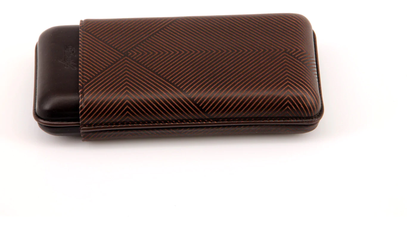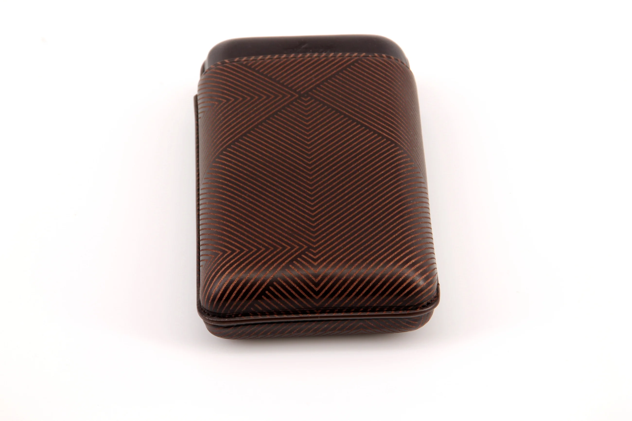 Het soepele donkerbruine leer van deze XL-3- Blad Sigarenkoker betovert met een eigentijds lijnenpatroon. Dit suggereert de eerste fase, het "blad" -stadium, van een sigaar. De combinatie levert een intrigerende stijlvolle look op die het publiek zeker zal doen gonzen.