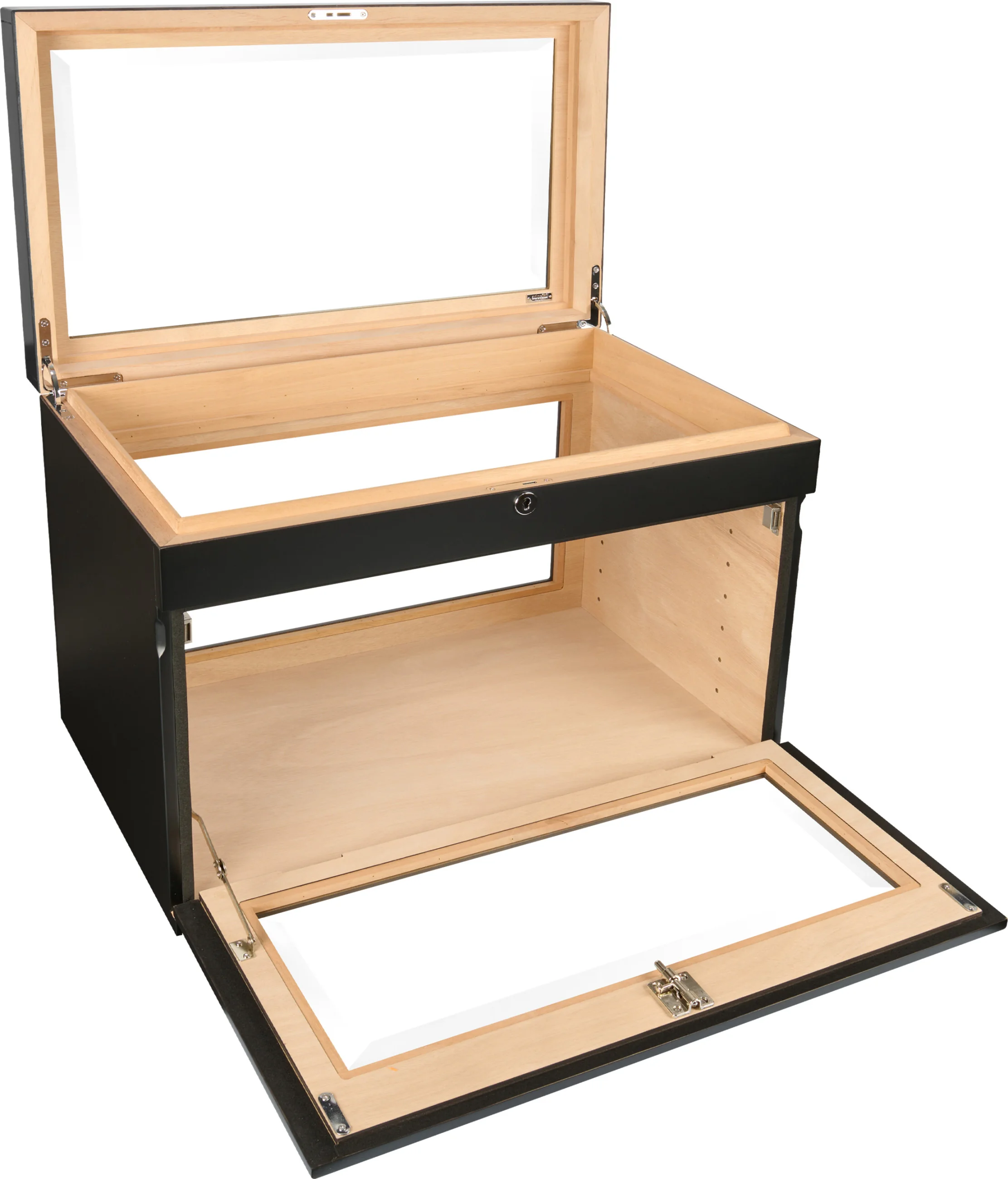 • Si la présentation doit être reléguée au second plan et que la capacité de stockage est primordiale, l'intérieur peut être entièrement rempli de plateaux optionnels, ou les plateaux peuvent être retirés pour utiliser l'espace exclusivement pour le stockage des étuis.