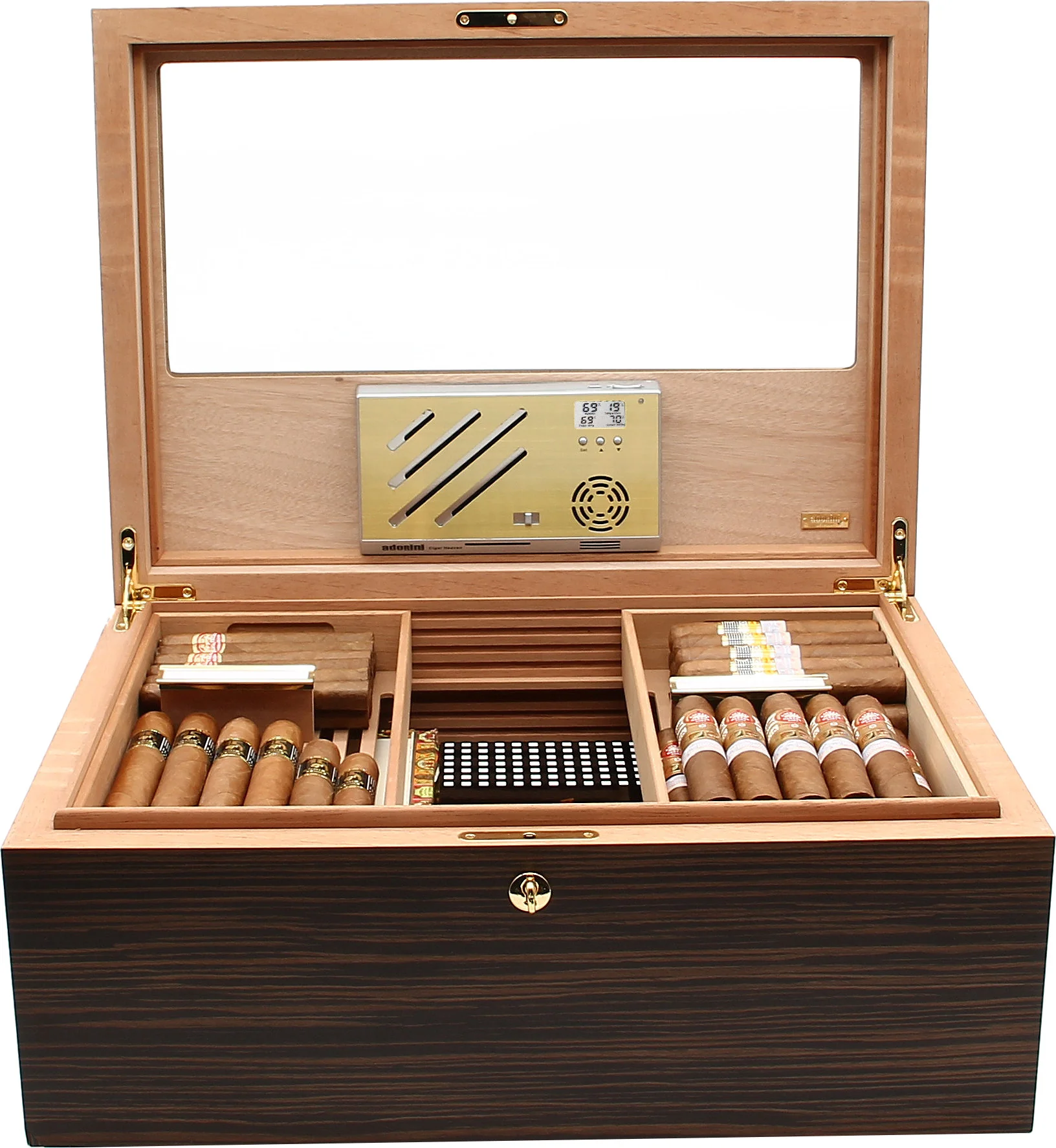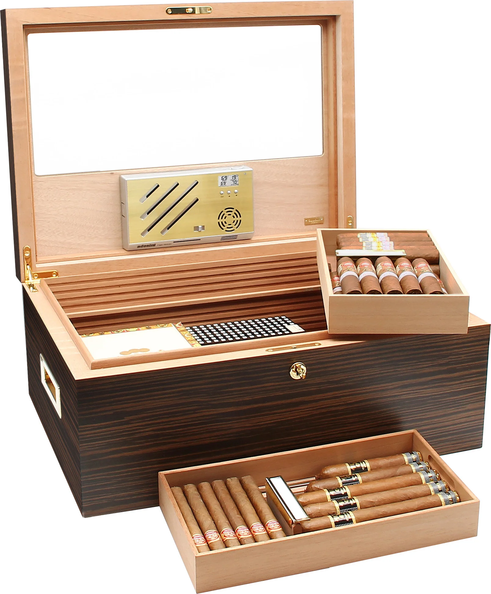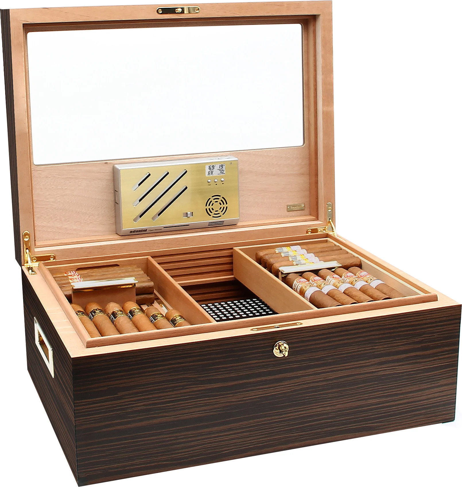 Une impressionnante capacité de 500 cigares Corona anime la cave magnifiquement conçue qui comprend une finition semi-brillante en placage d'ébène visuellement agréable et un couvercle avec une vitre partielle en verre. Les charnières à quadrant robustes et solide corpus donnent à l'humidificateur une base solide, un verrou et des poignées plaqués or fournissent sécurité et mobilité accrues. Le cèdre espagnol cuit à la vapeur extra-dur recouvre l'intérieur pour un environnement de cigares optimal, qui est encore amélioré par les nervures de ventilation innovantes Adorini RibTech qui aident à maximiser le flux d'air dans toute la cave.