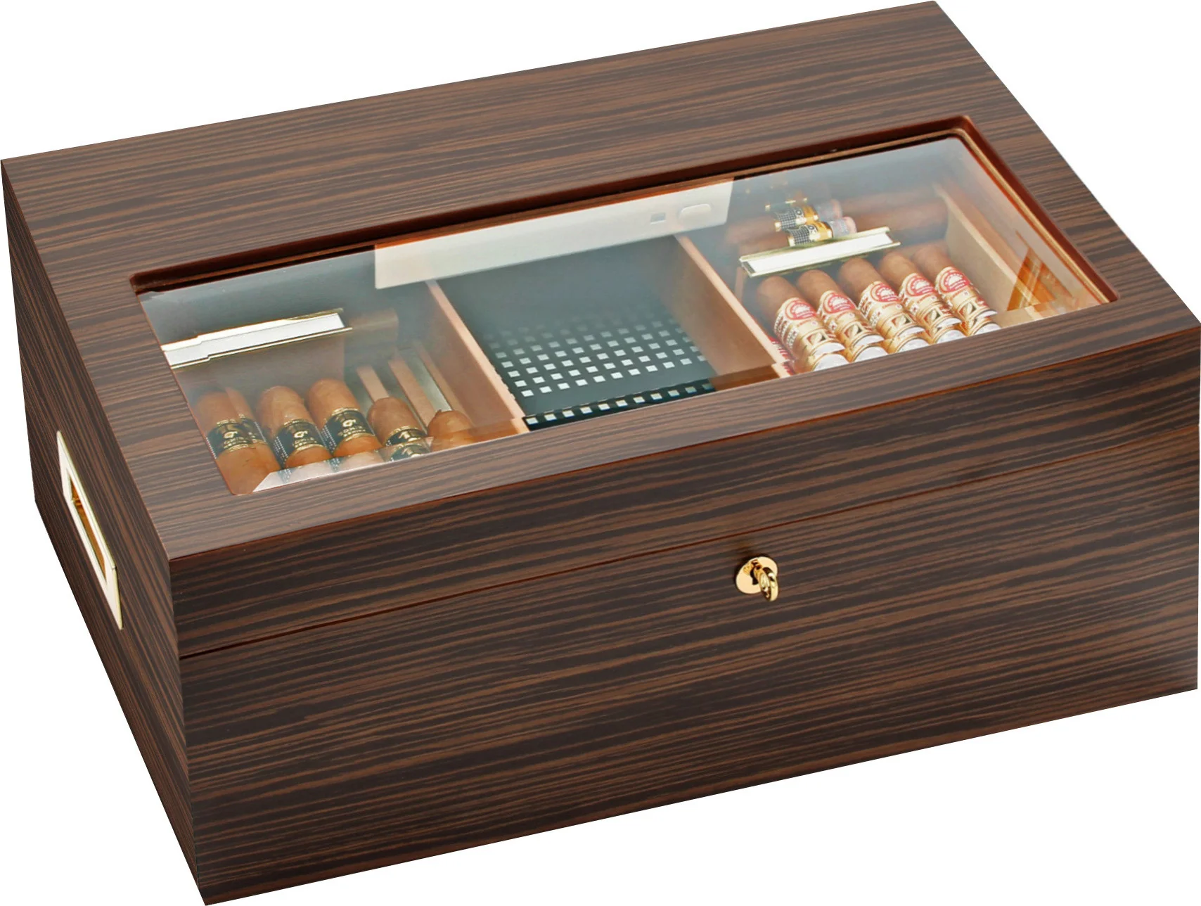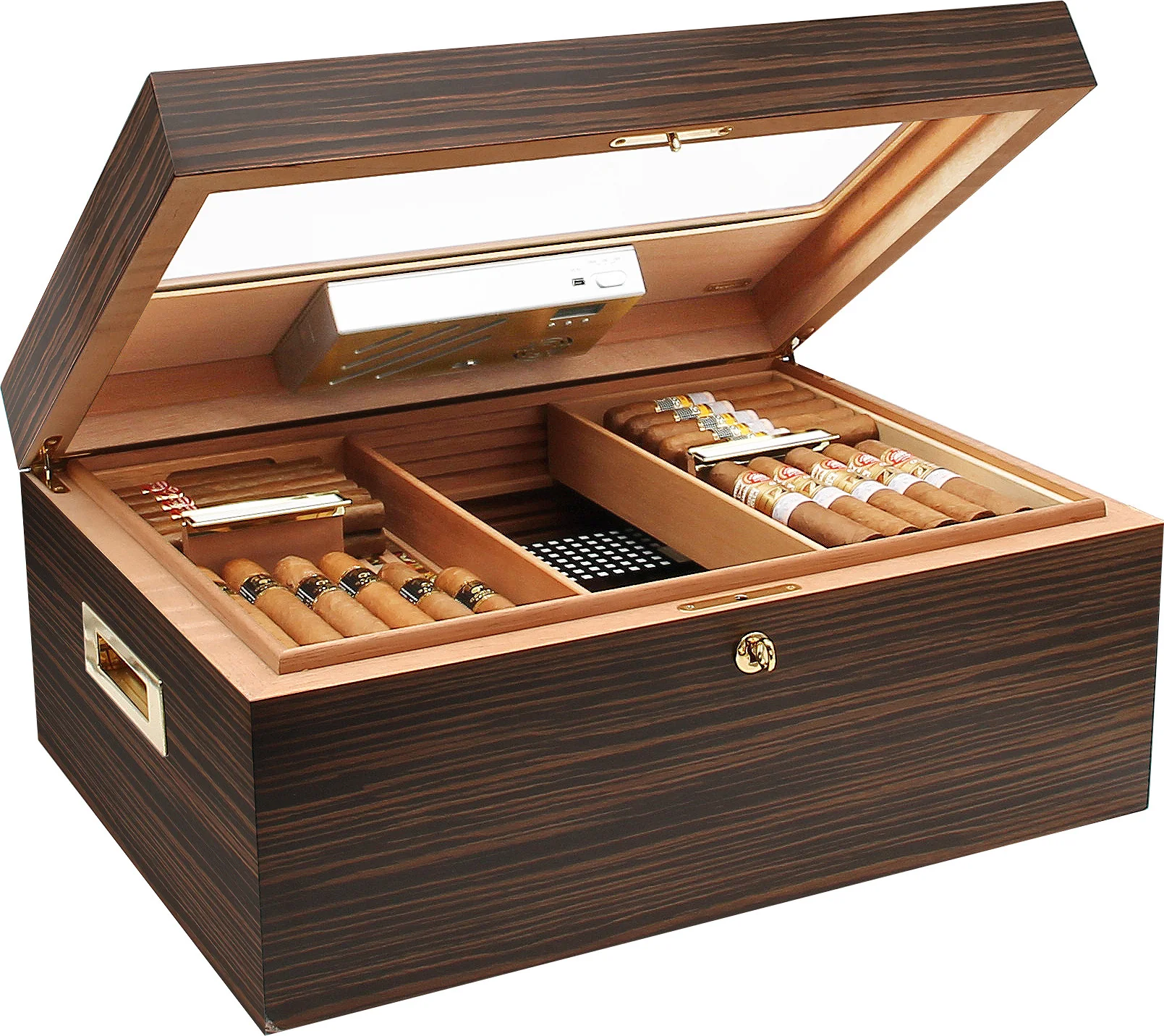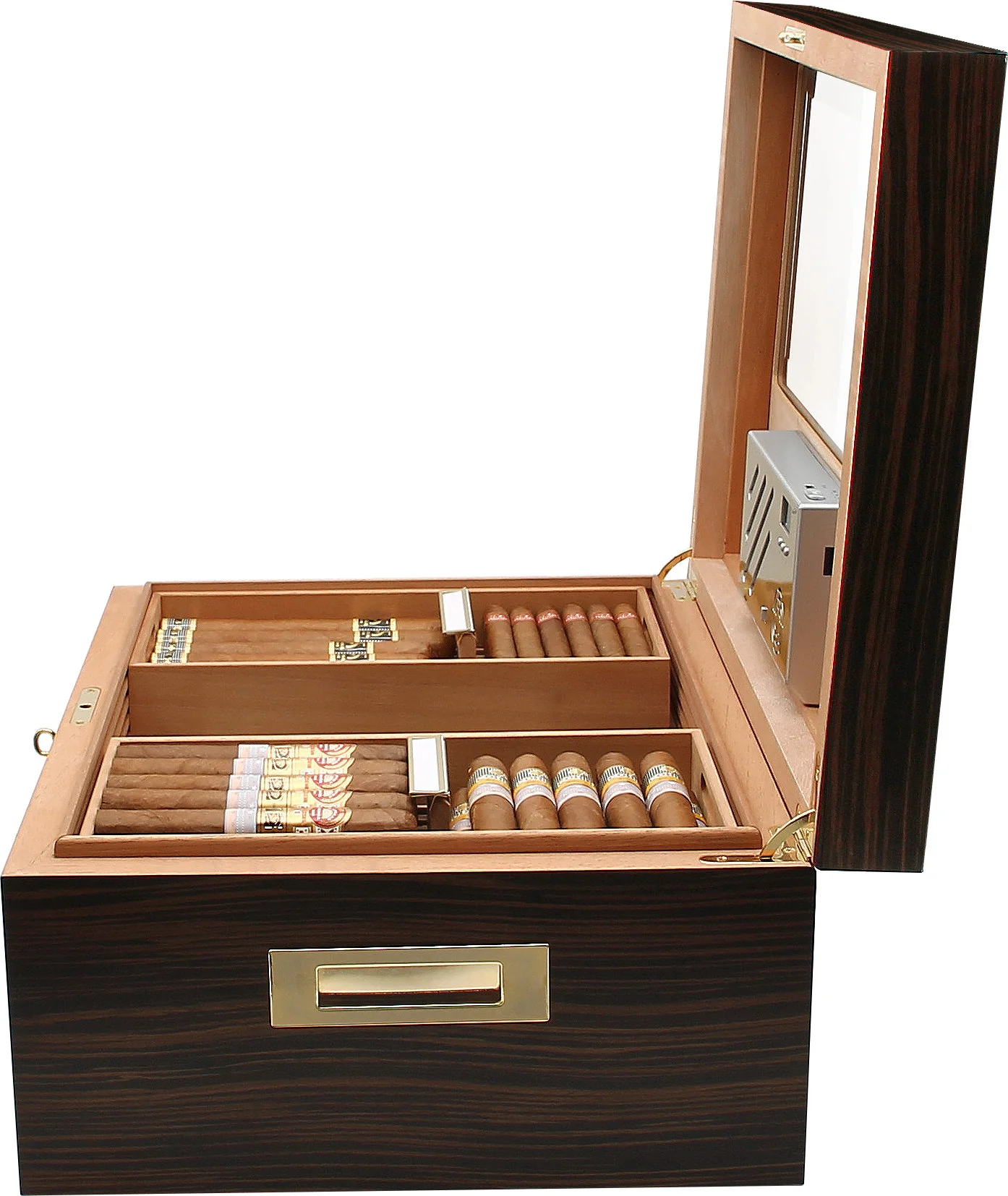 Une impressionnante capacité de 500 cigares Corona anime la cave magnifiquement conçue qui comprend une finition semi-brillante en placage d'ébène visuellement agréable et un couvercle avec une vitre partielle en verre. Les charnières à quadrant robustes et solide corpus donnent à l'humidificateur une base solide, un verrou et des poignées plaqués or fournissent sécurité et mobilité accrues. Le cèdre espagnol cuit à la vapeur extra-dur recouvre l'intérieur pour un environnement de cigares optimal, qui est encore amélioré par les nervures de ventilation innovantes Adorini RibTech qui aident à maximiser le flux d'air dans toute la cave.