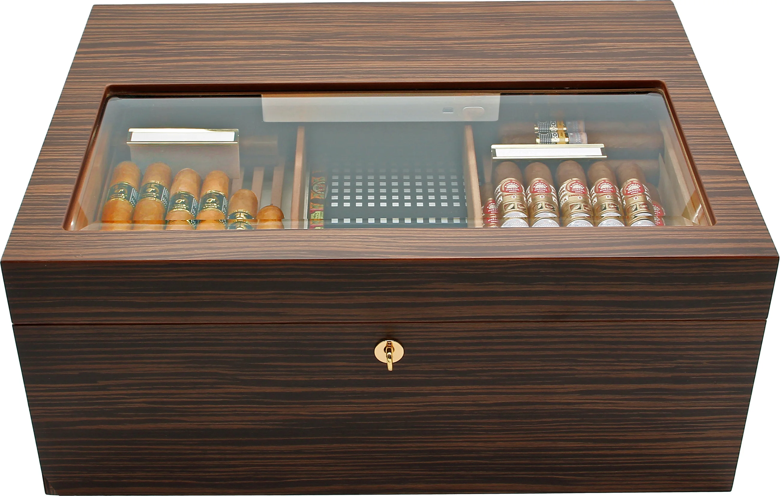 L’humidité est régulée par le système d’humidification électronique populaire Cigar Heaven 2ᵉ génération d’adorini. Cet humidificateur magnifiquement conçu peut être alimenté par un adaptateur secteur ou par sa batterie lithium-ion rechargeable intégrée, qui peut durer jusqu'à quatre semaines avec une seule charge. Le réservoir d'eau de l'appareil contient suffisamment d'eau pour près de deux mois d'humidification, qui peut être réglée manuellement entre 40 et 80% d'humidité relative. Un écran LCD affiche toutes les informations dont vous avez besoin pour maintenir des conditions idéales, y compris l'humidité et la température actuelles, les niveaux d'humidité élevés et faibles et le niveau d'humidité moyen sur 3 jours.