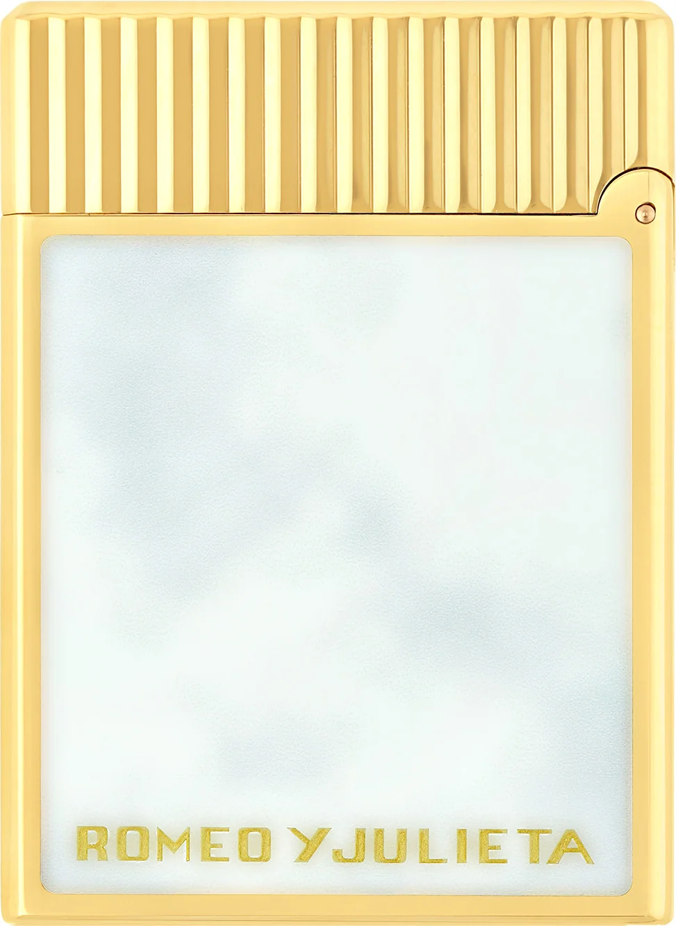 La face avant du briquet est ornée d'un médaillon en relief représentant la célèbre scène du balcon de Roméo et Juliette, symbole de l'amour et de la passion. La laque blanche entoure le médaillon, qui est également répété au dos. Vous y trouverez également l'élégante inscription "Romeo y Julieta".