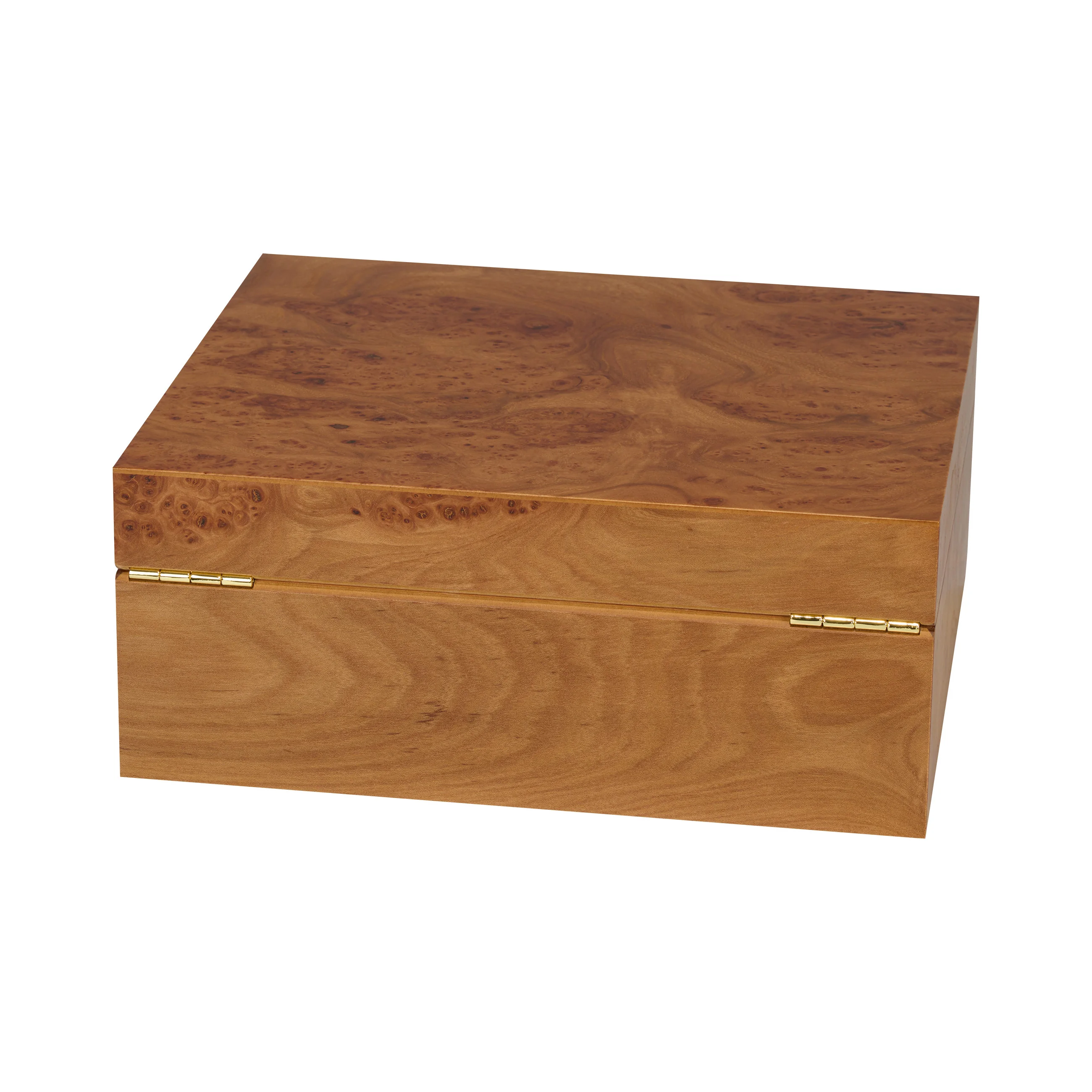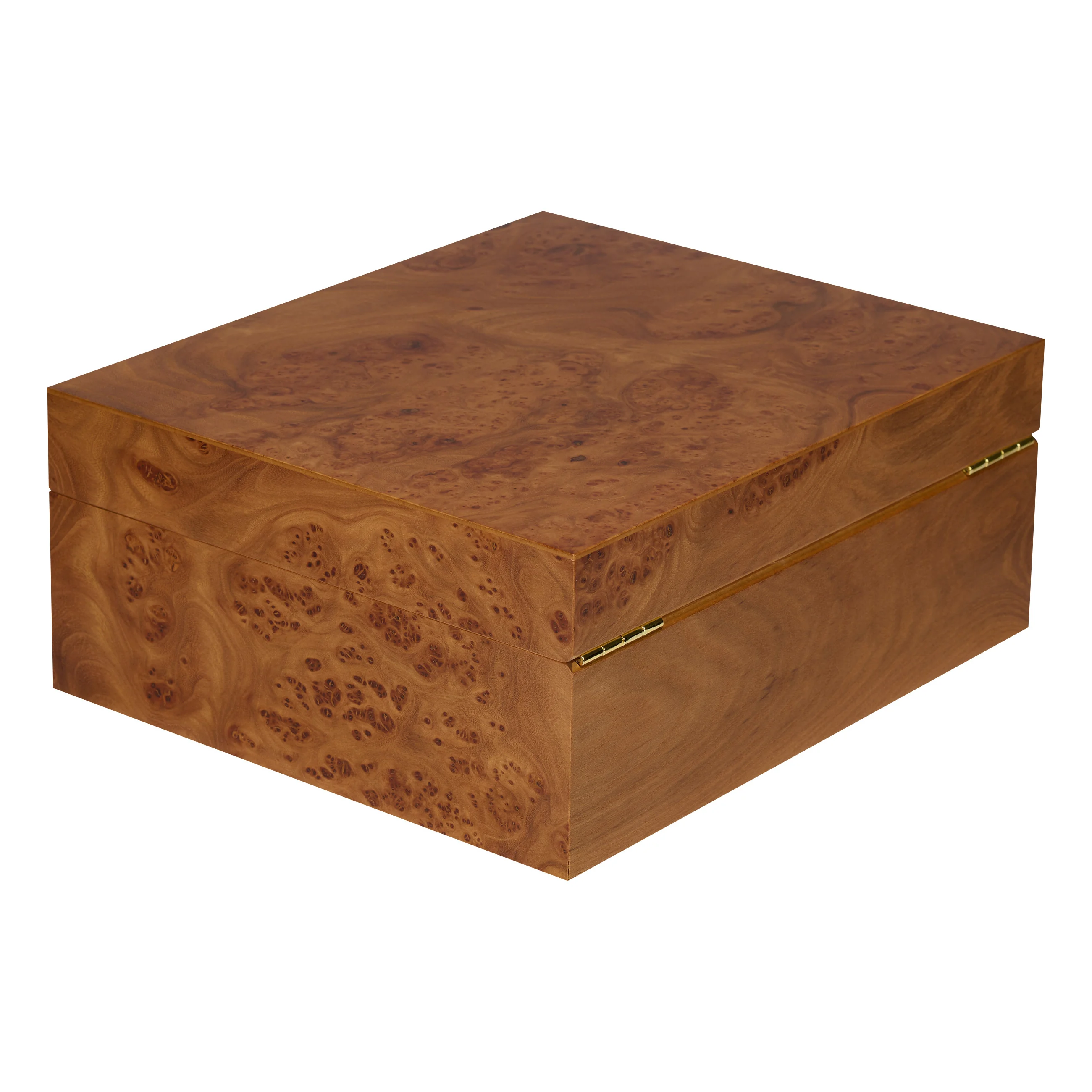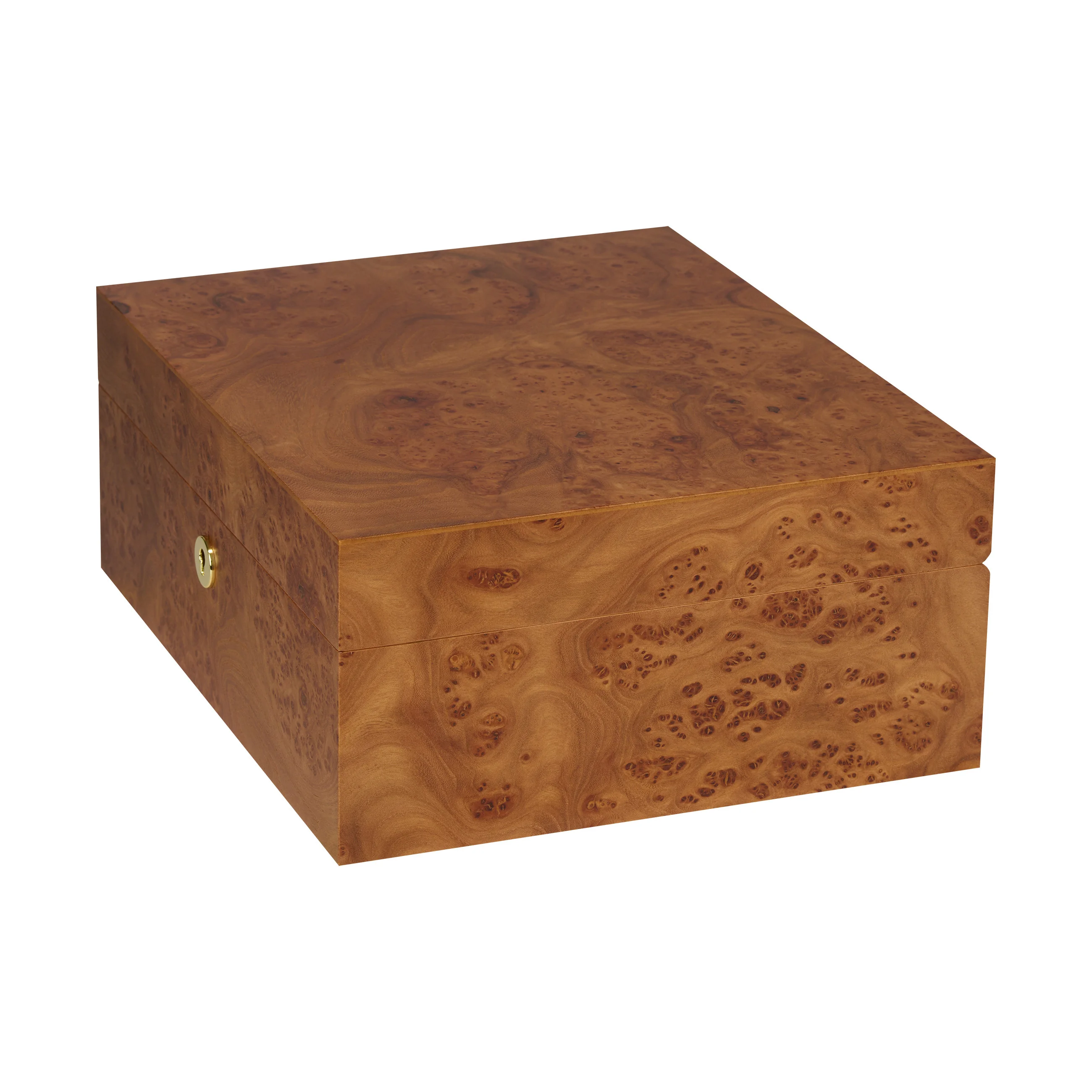 Le bois d'orme impressionne par son grain caractéristique aux tons chauds à brun foncé, entrecoupés de nœuds remarquables, également appelés « yeux ». Grâce à son aspect chaleureux et naturel, la cave s'intègre harmonieusement dans presque tous les environnements. Les caves de taille moyenne peuvent contenir jusqu'à 75 cigares, offrant ainsi suffisamment d'espace pour votre collection de cigares.