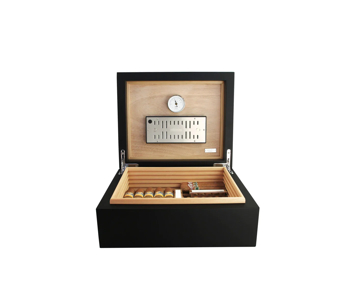 La cave à cigares est équipée d'un humidificateur à base d'un voile en polymère acrylique, qui assure une humidité constante à l'intérieur.