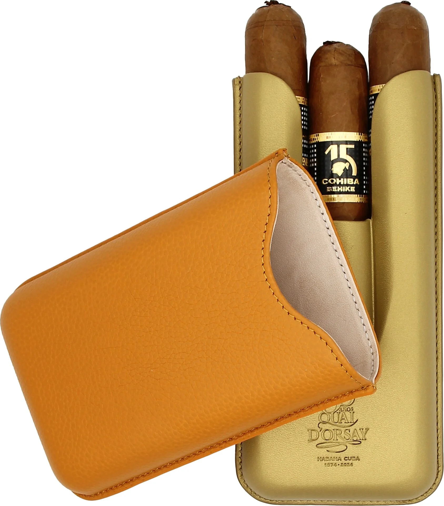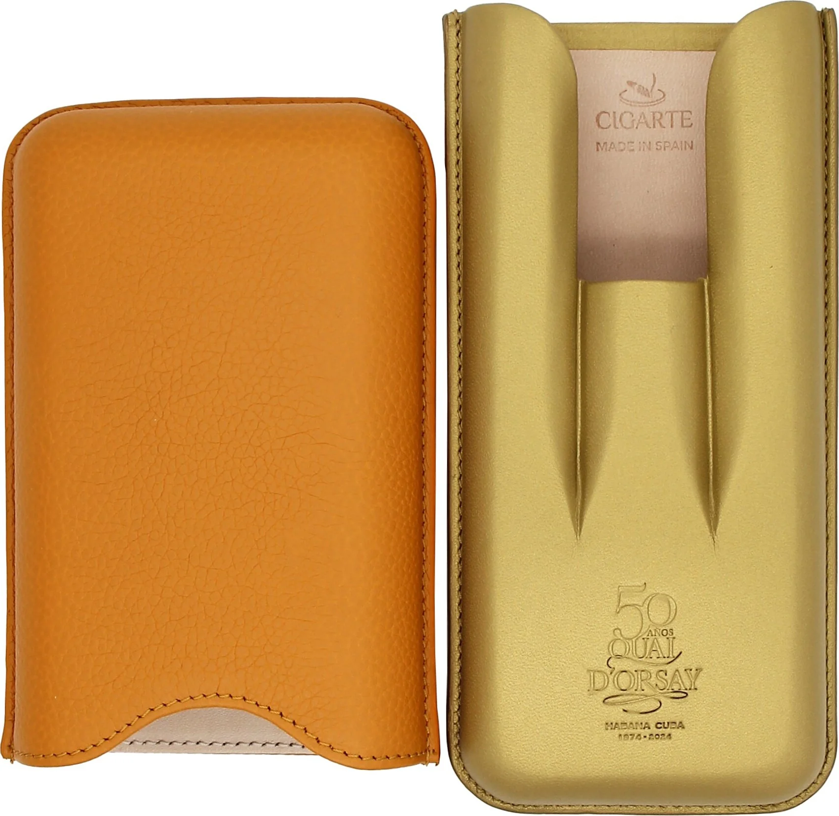 - **Fabrication et conception :** L'étui a été fabriqué par la société espagnole Cigarte en Espagne. Il présente une combinaison de couleurs orange et or élégant, avec du cuir gaufré sur le dessus et du cuir lisse sur le dessous.