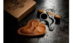 - Étui de haute qualité en cuir marron avec surpiqûres contrastées blanches, qui offre une protection et un rangement élégant.