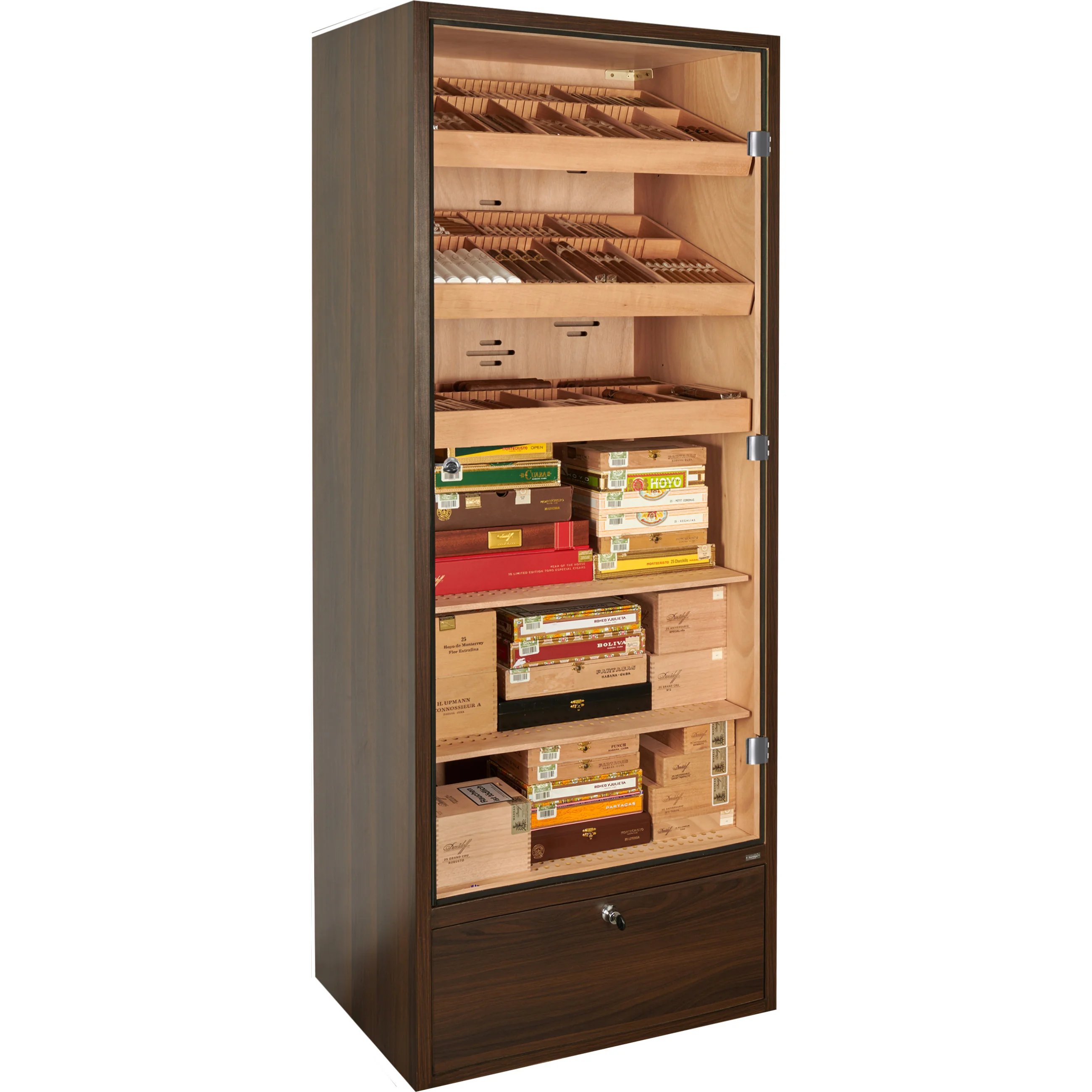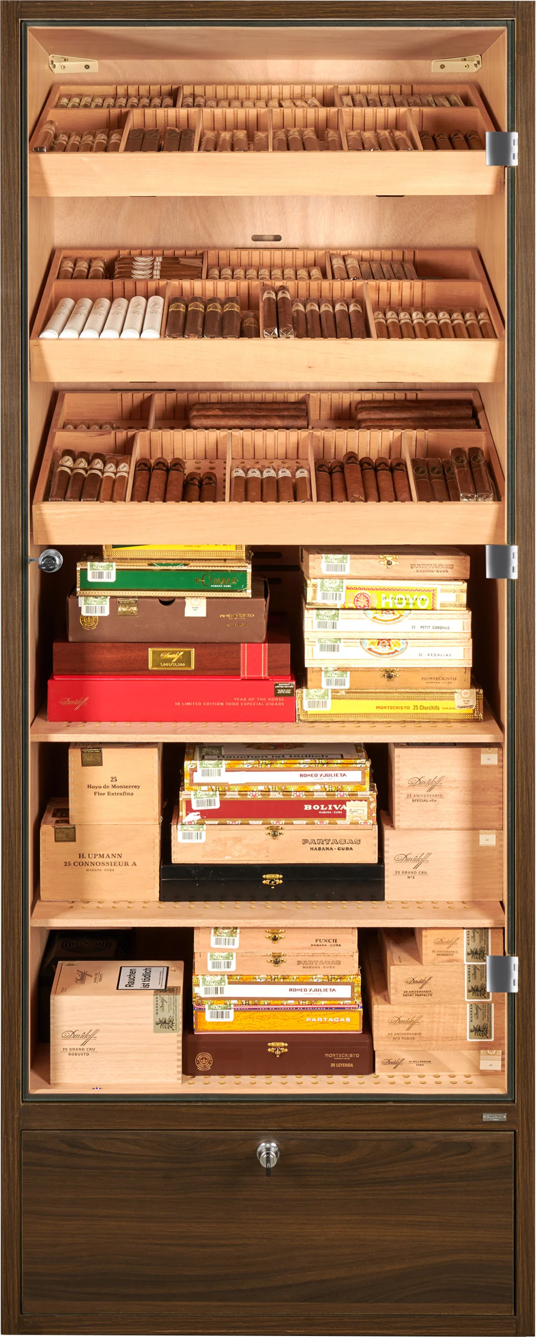 L'armoire à cigares offre un espace pouvant accueillir environ 2 800 cigares, calculé sur la base du format classique Mareva. Le rangement est conçu pour accueillir aussi bien des cigares individuels que des boîtes entières. L'intérieur est divisé en six niveaux et équipé de trois plateaux et de deux étagères.