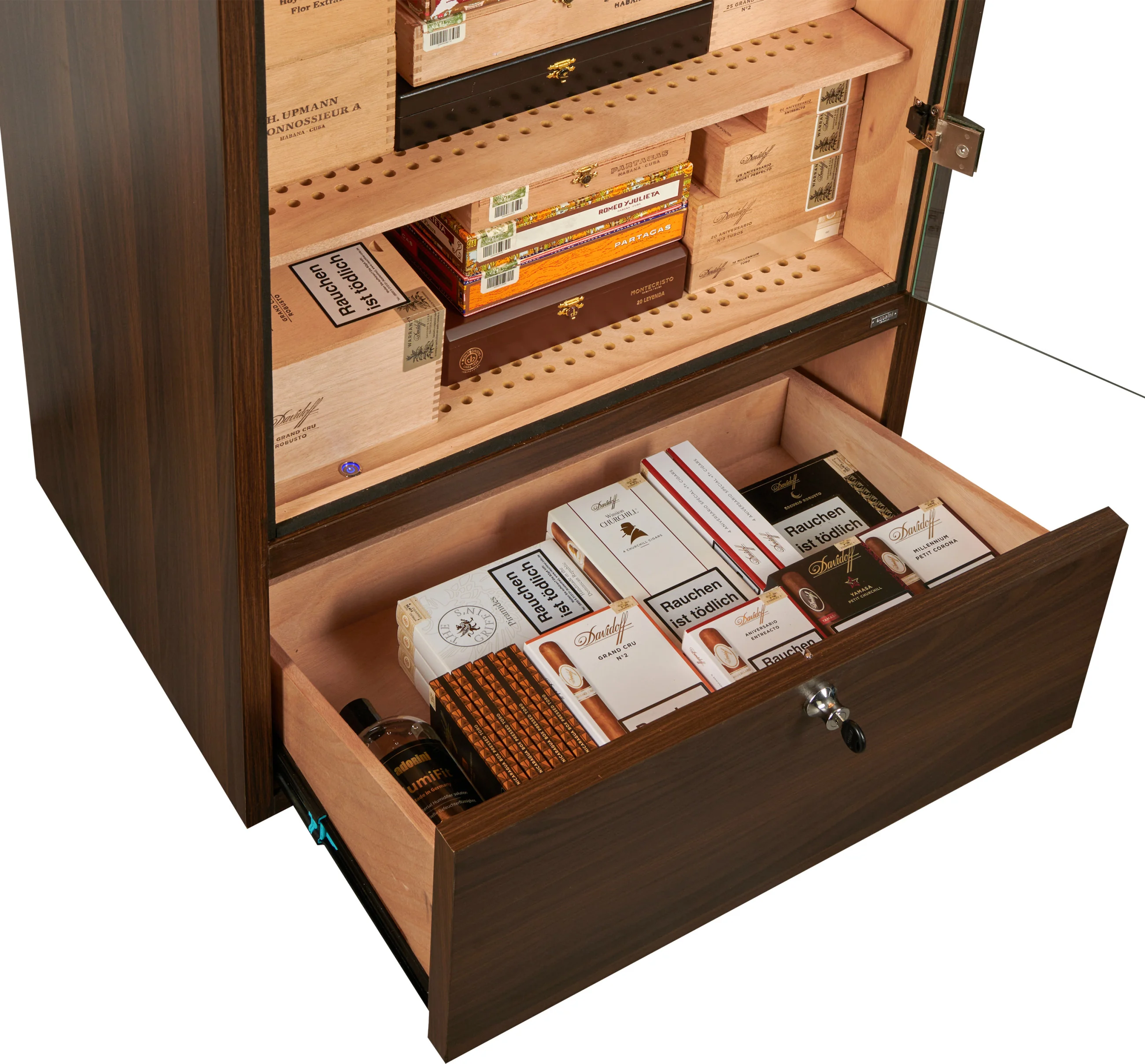 La base de l'armoire à cigares contient un tiroir verrouillable qui peut être utilisé pour ranger des cigares ainsi que des accessoires ou des consommables tels que de l'eau distillée. Le fond du tiroir est perforé et séparé de l'intérieur, ce qui permet à l'humidité de circuler et garantit un stockage sûr des cigares.