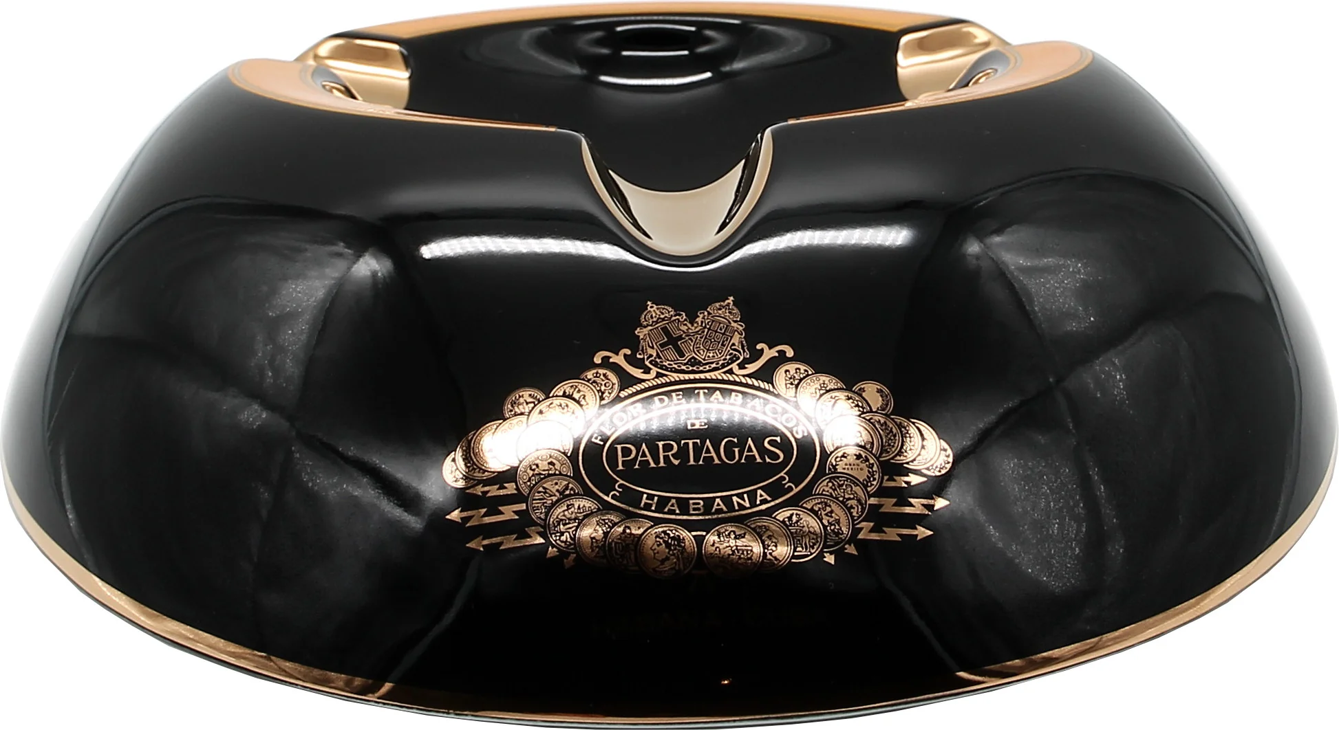 - Zwarte porseleinen sigarenasbak met de kenmerkende accenten van Partagás