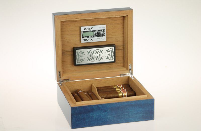 - Siglo humidors onderscheiden zich door hun onberispelijke glanzende afwerkingen. Indrukwekkende glanzende blauwe afwerking bovenop een houtfineer.