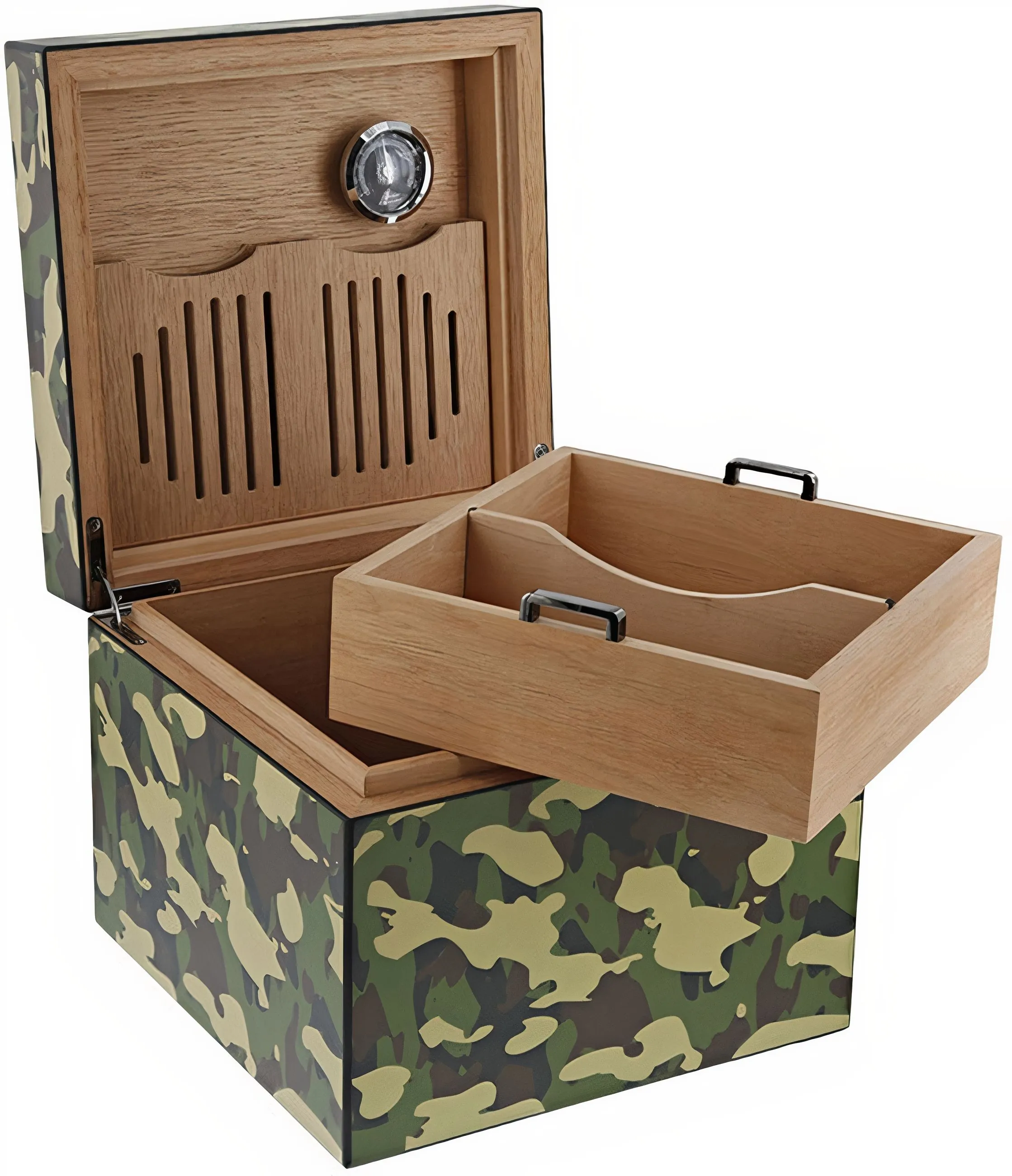 - Moderne kubus humidor met een opvallend camouflagepatroon en subtiel gedrukte S.T. Dupont letters op de voorkant van het deksel.