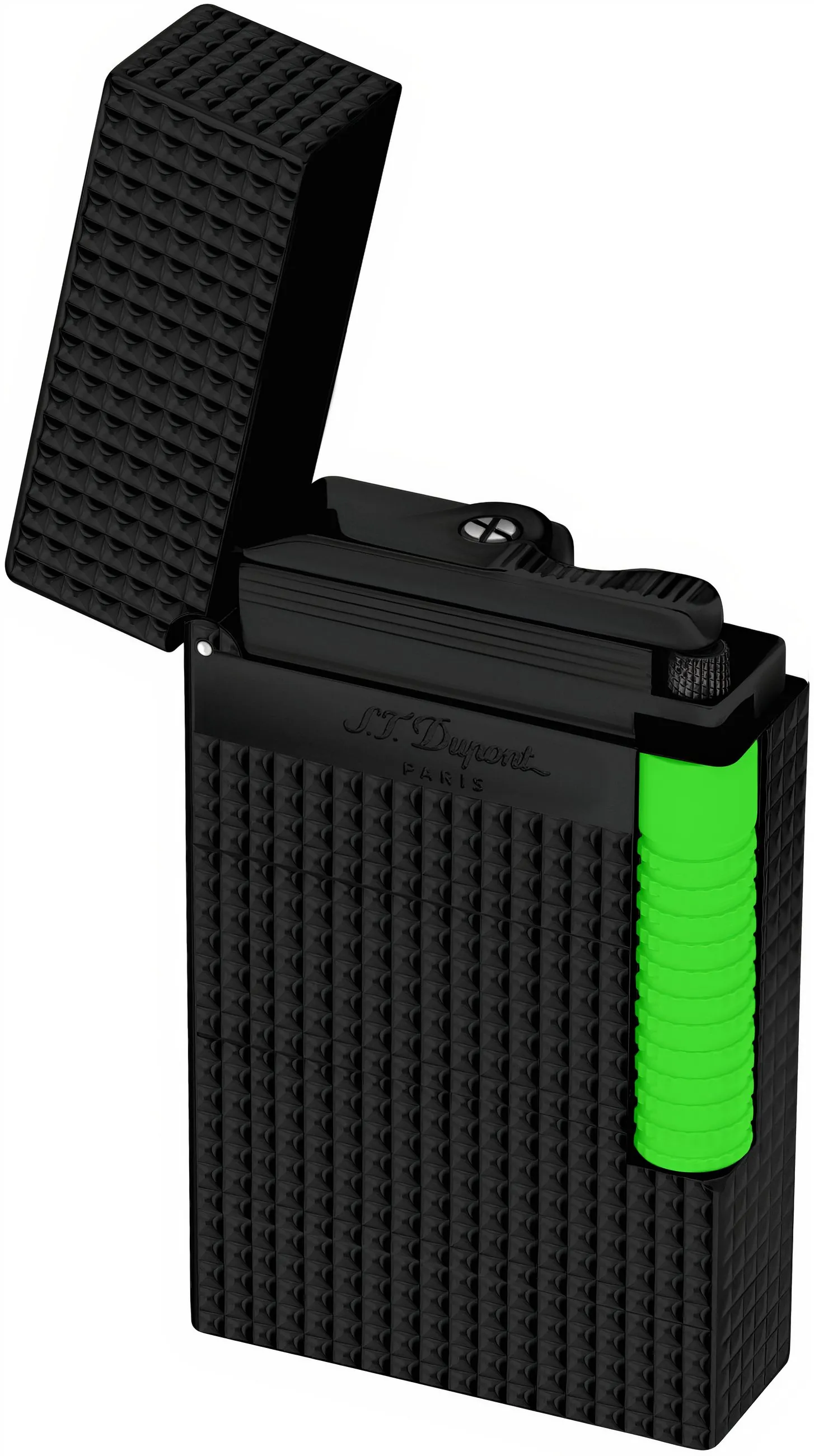- De Fluo aansteker in groen combineert een guillochepatroon met een halfmatte afwerking die de felle groene tint accentueert, waardoor een eigentijdse look ontstaat.