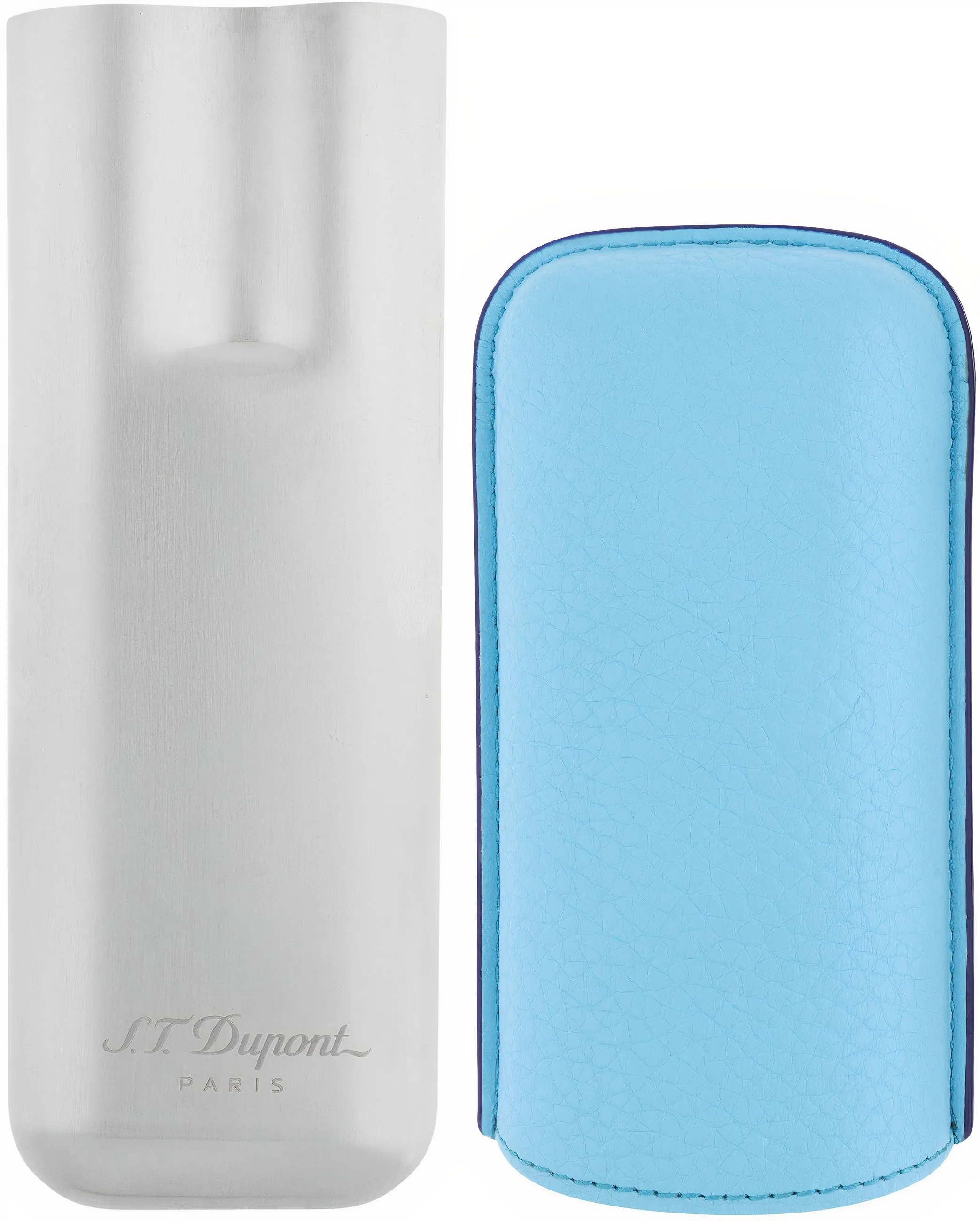 De **S.T. Dupont sigarenkoker voor 2 sigaren in turquoise met chroom** is een elegante en modern uitziende sigarenkoker van het Franse luxemerk S.T. Dupont. Het bovendeel is gemaakt van hoogwaardig lichtblauw gekleurd rundleer dat is verwerkt in Spanje en is aan de binnenkant voorzien van een reliëf met "Made in Spain". Het leer heeft een decoratieve naad aan de buitenkant die het elegante totaalbeeld van de sigarenkoker onderstreept. Het onderste gedeelte van de koker is gemaakt van glanzend chroom, wat ideaal is voor het vervoeren van twee sigaren omdat het druk- en breukbestendig is. Een bijzonder kenmerk is de inkeping in het bovenste gedeelte van de metalen basis, die voorkomt dat de sigaren of een enkele sigaar die nog in de koker zit heen en weer rollen. De diameter van de roestvrijstalen koker is 2,45 cm en er passen dus twee sigaren in met een maximale ringmaat van 61. De lengte van de koker is variabel van ca. 160 mm tot ca. 220 mm wanneer deze volledig is ingeschoven. Het artikel wordt geleverd in een representatieve verpakking, waardoor het ideaal is als cadeau. Maak een zelfverzekerde en modern-sportieve liefhebber blij met deze trouwe metgezel. Een garantiekaart en verzorgingsinstructies van Dupont worden meegeleverd.